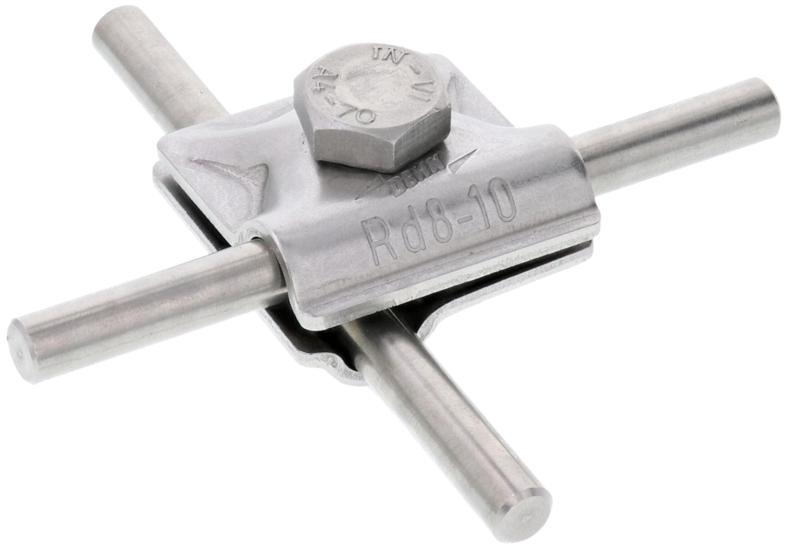 MehrzweckVerbindungs-Klemme nach DIN EN 62561-1, zur universellen Verwendung als Kreuz-, T- und Parallelklemme von Rundleitern. Ausführung zweiteilig mit Sechskantschraube und Gewinde im Unterteil.