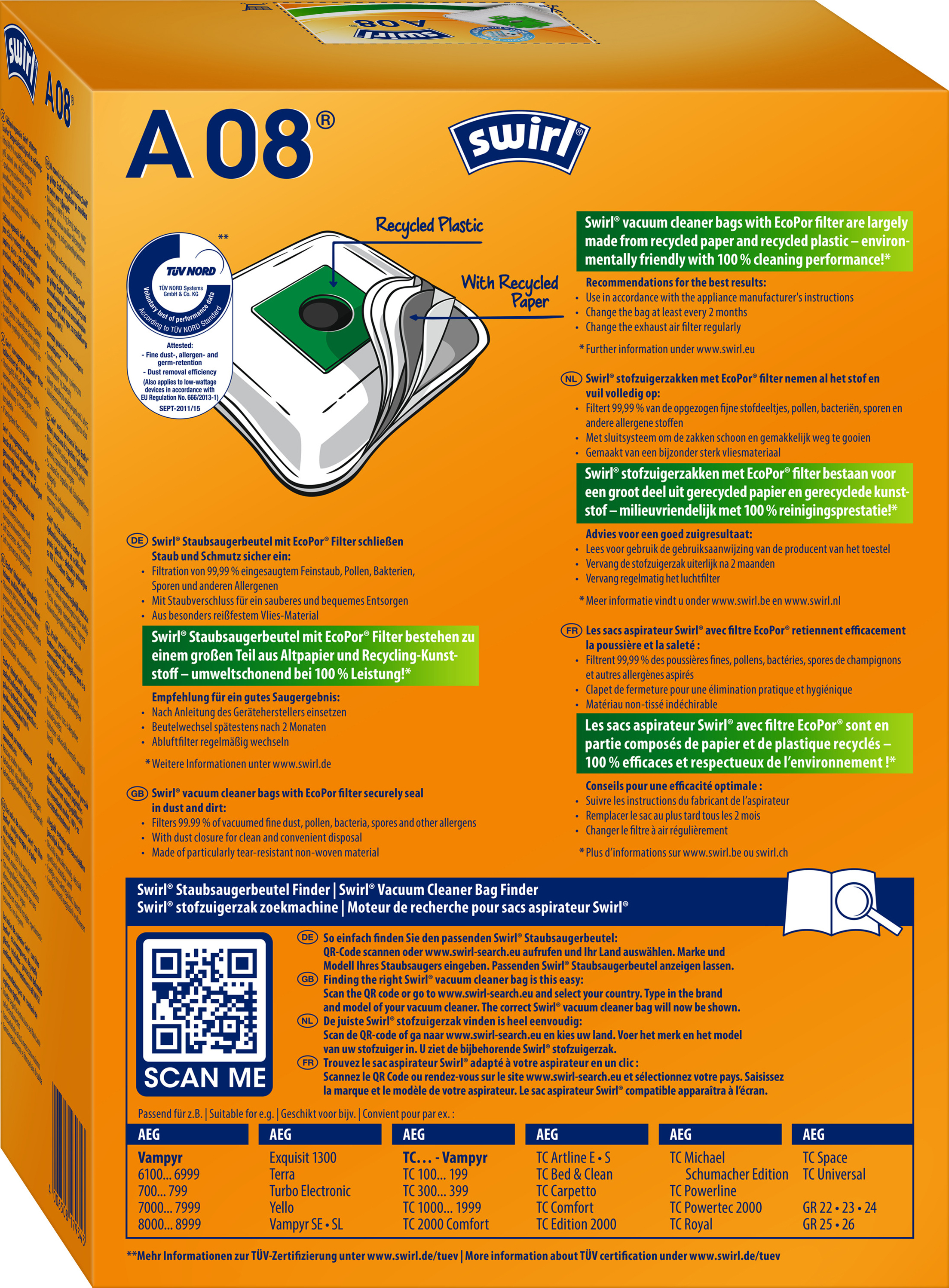 Swirl® MicroPor® Plus Staubsaugerbeutel mit AntiBac System, MicroPor® Plus Filtration mit Anti-Allergen-Filter hält nicht nur normalen Hausstaub, sondern auch allergenen Feinstaub im Beutel fest, das AntiBac System vermindert das Wachstum von Bakterien auf verschiedenen Lagen des Beutels, praktischer Dirtlock® Staubverschluss für eine bequeme, staubfreie Entsorgung des vollen Staubsaugerbeutels, ressourcenschonend durch Einsatz von 40 % Recyclingmaterial und nachwachsenden Rohstoffen, Feinstaub-, Allergen- und Keimfiltration sowie Staubaufnahmevermögen vom TÜV NORD zertifiziert - auch für Niedrigwattgeräte gem. EU Verordnung Nr. 666/2013-I, MicroPor® Plus-Qualität für eine lange Nutzungsdauer, optimale Passform dank abgerundeter Ecken, jede Verpackung mit praktischer Einkaufshilfe, Inhalt: 4 Stck. + 1 Filter, geeignet für AEG-Geräte
