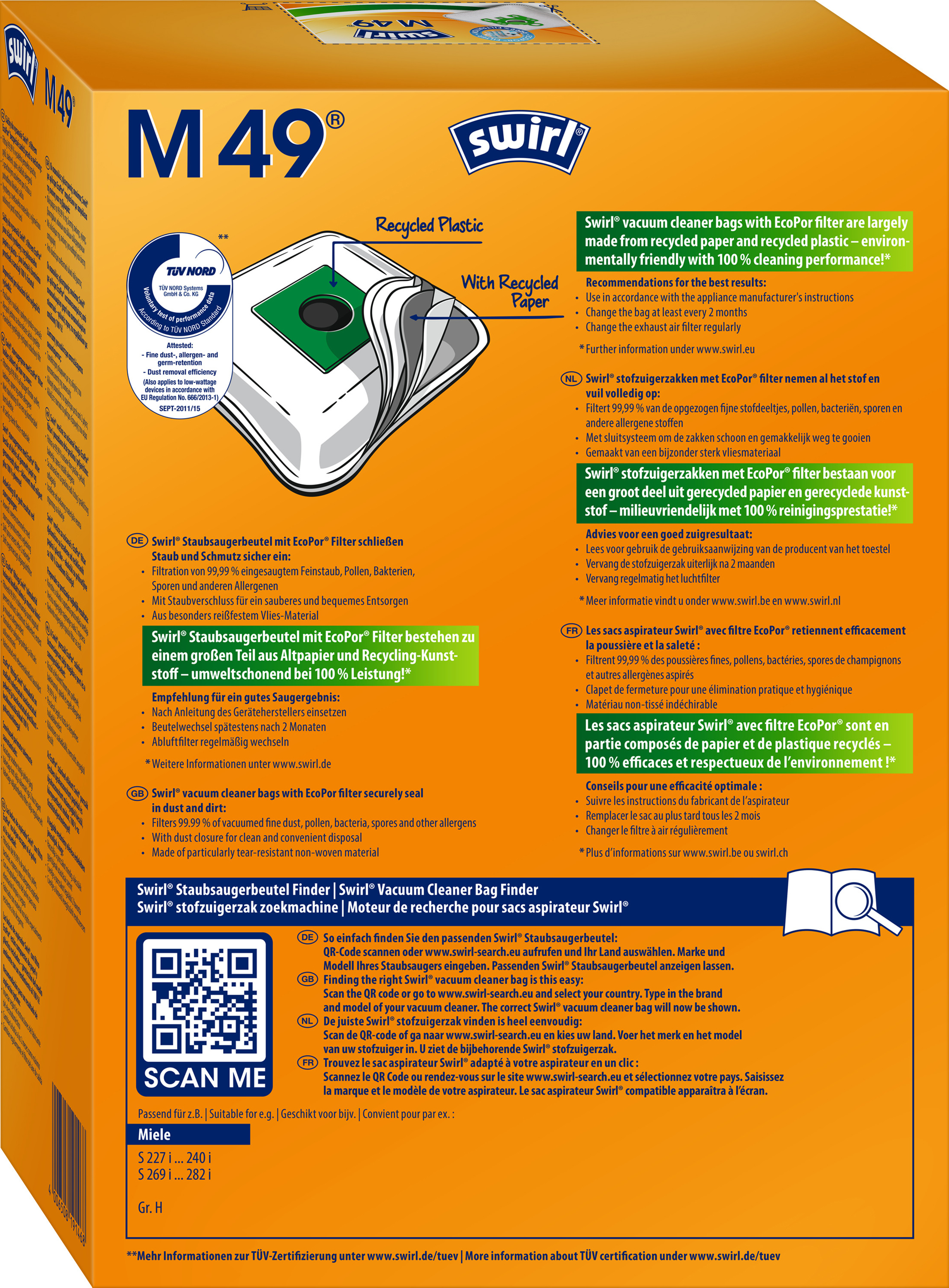 Swirl® MicroPor® Plus Green Staubsaugerbeutel mit erhöhtem Anteil an recycelten Materialien und nachwachsenden Rohstoffen, ressourcenschonend durch den Einsatz von bis zu 65 % Recyclingmaterial und nachwachsenden Rohstoffen (je nach Staubsaugerbeuteltyp), MicroPor® Plus Filtration mit Anti-Allergen-Filter hält nicht nur normalen Hausstaub, sondern auch allergenen Feinstaub im Beutel fest, praktischer Dirtlock® Staubverschluss für eine bequeme, staubfreie Entsorgung des vollen Staubsaugerbeutels, Feinstaub-, Allergen- und Keimfiltration sowie Staubaufnahmevermögen vom TÜV NORD zertifiziert - auch für Niedrigwattgeräte gem. EU Verordnung Nr. 666/2013-I, Swirl® MicroPor® Plus Staubsaugerbeutel werden zu 100 % in Deutschland gefertigt, Verpackung zu 100 % aus Altpapier und vollständig recycelbar, optimale Passform und lange Nutzungsdauer dank abgerundeter Ecken und Volumen-Staubspeicher, jede Verpackung mit praktischer Einkaufshilfe, geeignet für Miele Staubsauger
