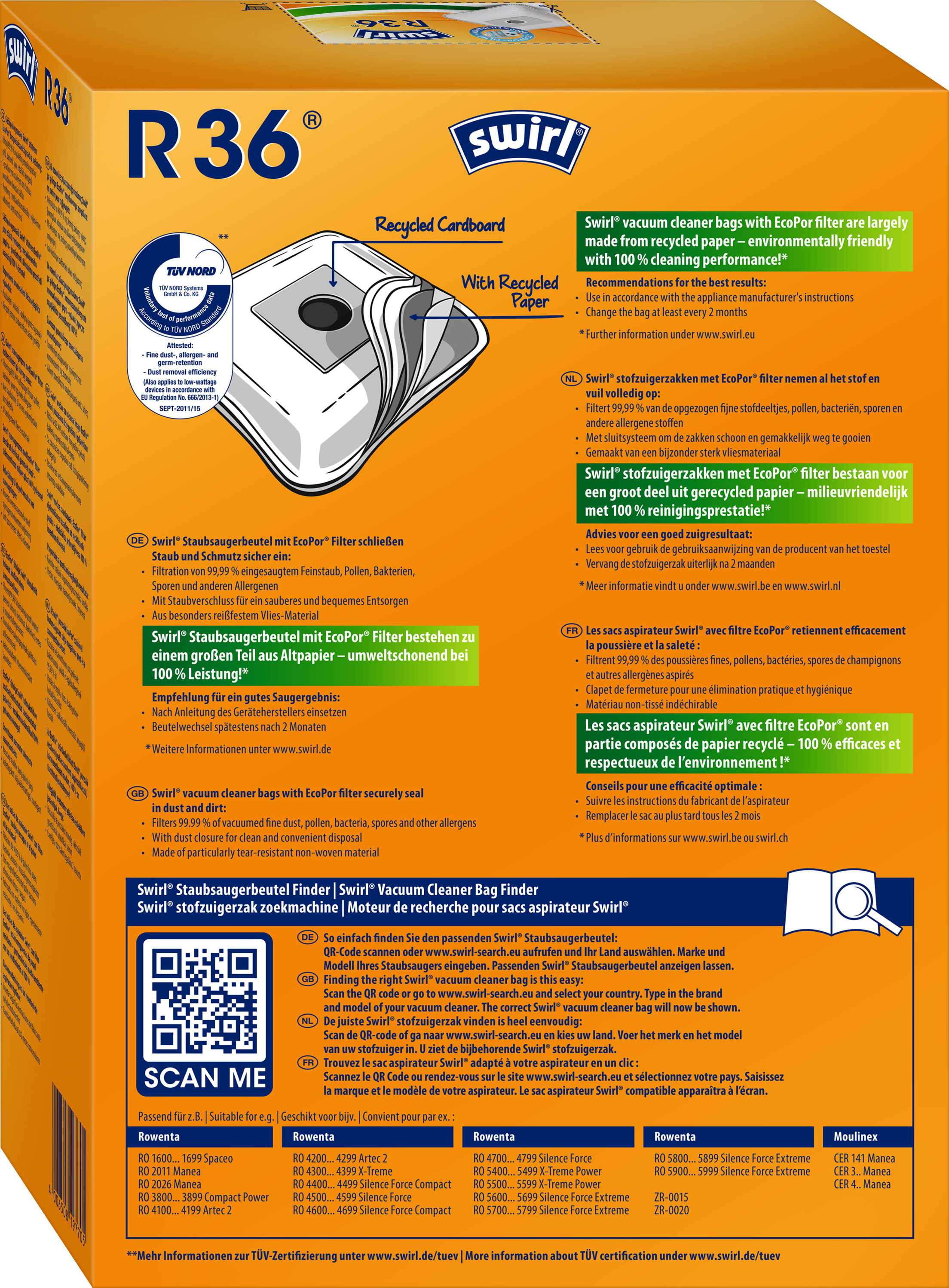 Swirl® MicroPor® Plus Green Staubsaugerbeutel mit erhöhtem Anteil an recycelten Materialien und nachwachsenden Rohstoffen, ressourcenschonend durch den Einsatz von bis zu 65 % Recyclingmaterial und nachwachsenden Rohstoffen (je nach Staubsaugerbeuteltyp), MicroPor® Plus Filtration mit Anti-Allergen-Filter hält nicht nur normalen Hausstaub, sondern auch allergenen Feinstaub im Beutel fest, praktischer Dirtlock® Staubverschluss für eine bequeme, staubfreie Entsorgung des vollen Staubsaugerbeutels, Feinstaub-, Allergen- und Keimfiltration sowie Staubaufnahmevermögen vom TÜV NORD zertifiziert - auch für Niedrigwattgeräte gem. EU Verordnung Nr. 666/2013-I, Swirl® MicroPor® Plus Staubsaugerbeutel werden zu 100 % in Deutschland gefertigt, Verpackung zu 100 % aus Altpapier und vollständig recycelbar, optimale Passform und lange Nutzungsdauer dank abgerundeter Ecken und Volumen-Staubspeicher, jede Verpackung mit praktischer Einkaufshilfe, geeignet für Rowenta Staubsauger