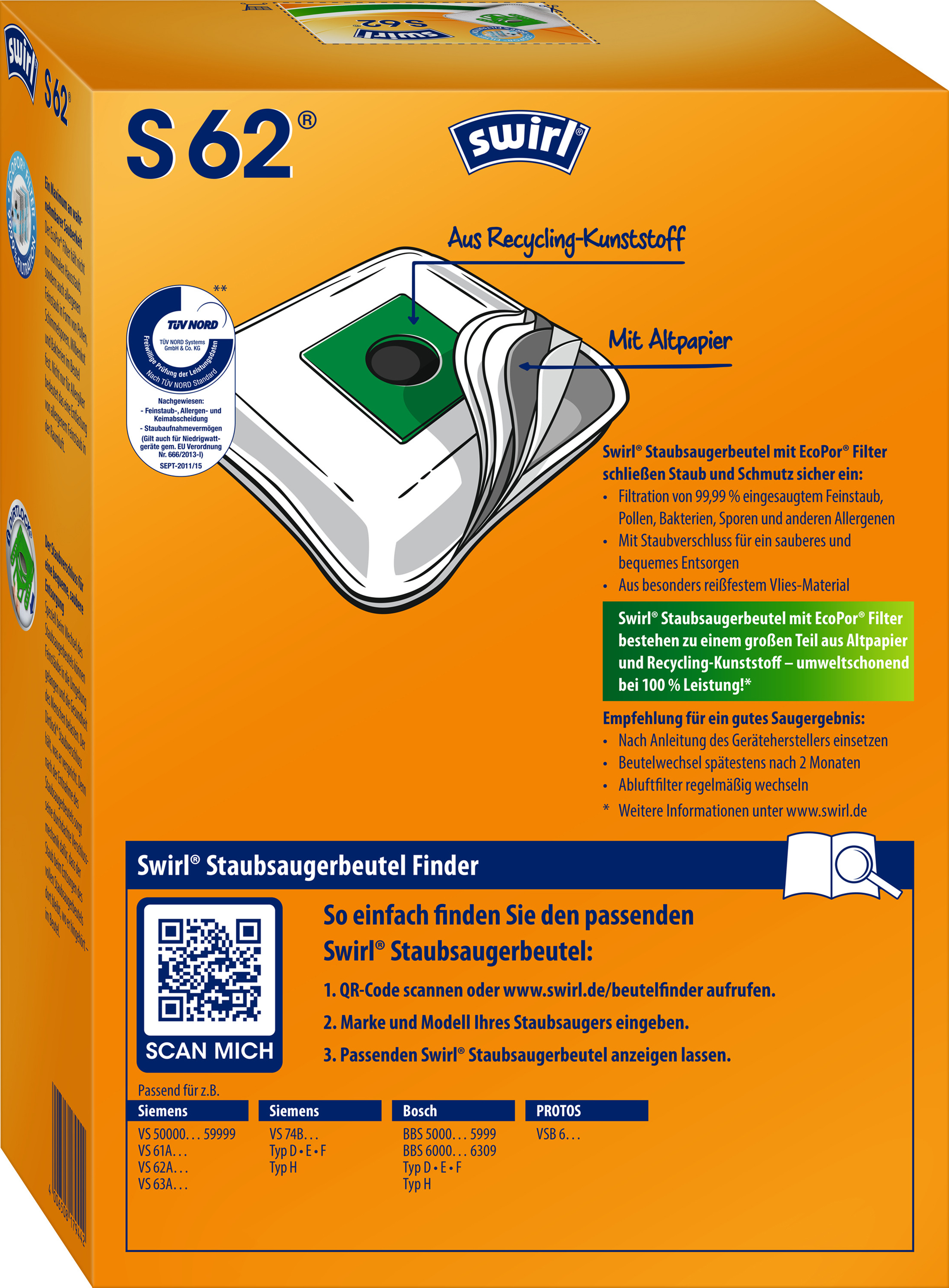 Swirl® MicroPor® Plus Green Staubsaugerbeutel mit erhöhtem Anteil an recycelten Materialien und nachwachsenden Rohstoffen, ressourcenschonend durch den Einsatz von bis zu 65 % Recyclingmaterial und nachwachsenden Rohstoffen (je nach Staubsaugerbeuteltyp), MicroPor® Plus Filtration mit Anti-Allergen-Filter hält nicht nur normalen Hausstaub, sondern auch allergenen Feinstaub im Beutel fest, praktischer Dirtlock® Staubverschluss für eine bequeme, staubfreie Entsorgung des vollen Staubsaugerbeutels, Feinstaub-, Allergen- und Keimfiltration sowie Staubaufnahmevermögen vom TÜV NORD zertifiziert - auch für Niedrigwattgeräte gem. EU Verordnung Nr. 666/2013-I, Swirl® MicroPor® Plus Staubsaugerbeutel werden zu 100 % in Deutschland gefertigt, Verpackung zu 100 % aus Altpapier und vollständig recycelbar, optimale Passform und lange Nutzungsdauer dank abgerundeter Ecken und Volumen-Staubspeicher, jede Verpackung mit praktischer Einkaufshilfe, geeignet für Siemens/Bosch Staubsauger