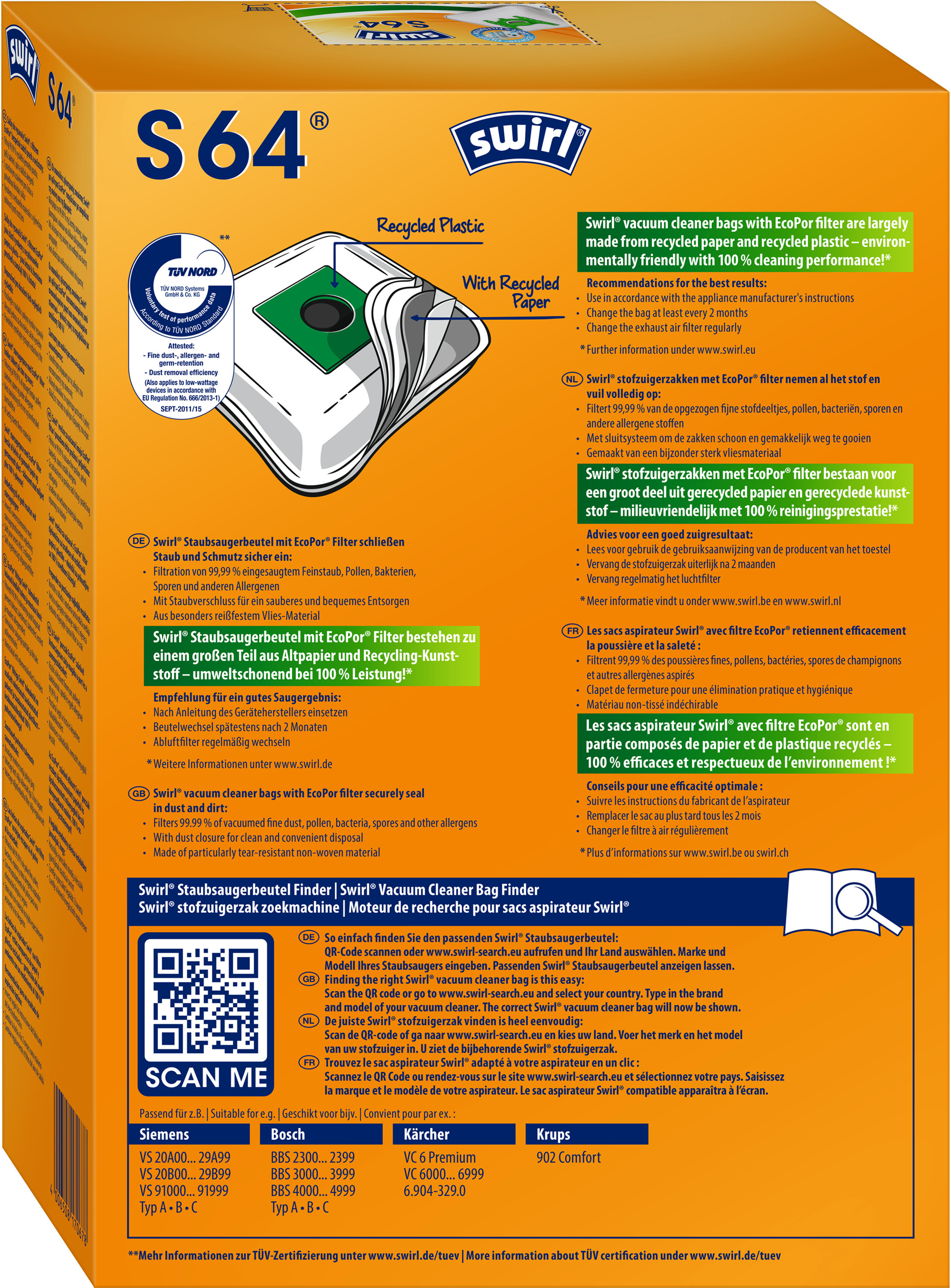 Swirl® MircoPor® Staubsaugerbeutel, praktischer Dirtlock® Staubverschluss für eine bequeme, staubfreie, Entsorgung des vollen Staubsaugerbeutels, ressourcenschonend durch Einsatz von 40 % Recyclingmaterial und nachwachsenden Rohstoffen, MicroPor®-Qualität für eine lange Nutzungsdauer, aus reißfestem Vliesmaterial, jede Verpackung mit praktischer Einkaufshilfe, geeignet für Siemens/Bosch Bodenstaubsauger