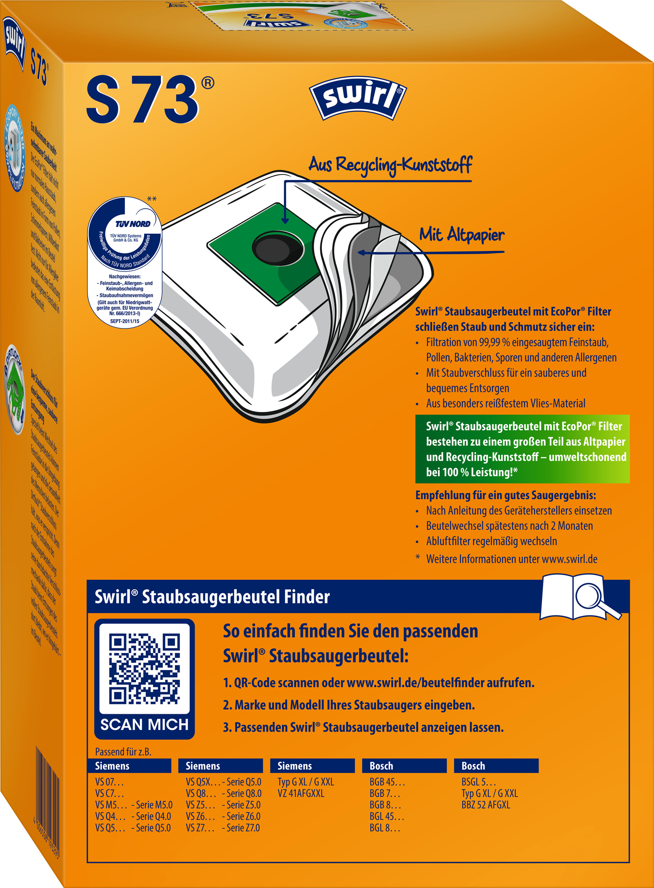Swirl® MicroPor® Plus Green Staubsaugerbeutel mit erhöhtem Anteil an recycelten Materialien und nachwachsenden Rohstoffen, ressourcenschonend durch den Einsatz von bis zu 65 % Recyclingmaterial und nachwachsenden Rohstoffen (je nach Staubsaugerbeuteltyp), MicroPor® Plus Filtration mit Anti-Allergen-Filter hält nicht nur normalen Hausstaub, sondern auch allergenen Feinstaub im Beutel fest, praktischer Dirtlock® Staubverschluss für eine bequeme, staubfreie Entsorgung des vollen Staubsaugerbeutels, Feinstaub-, Allergen- und Keimfiltration sowie Staubaufnahmevermögen vom TÜV NORD zertifiziert - auch für Niedrigwattgeräte gem. EU Verordnung Nr. 666/2013-I, Swirl® MicroPor® Plus Staubsaugerbeutel werden zu 100 % in Deutschland gefertigt, Verpackung zu 100 % aus Altpapier und vollständig recycelbar, optimale Passform und lange Nutzungsdauer dank abgerundeter Ecken und Volumen-Staubspeicher, jede Verpackung mit praktischer Einkaufshilfe, geeignet für Siemens/Bosch Staubsauger