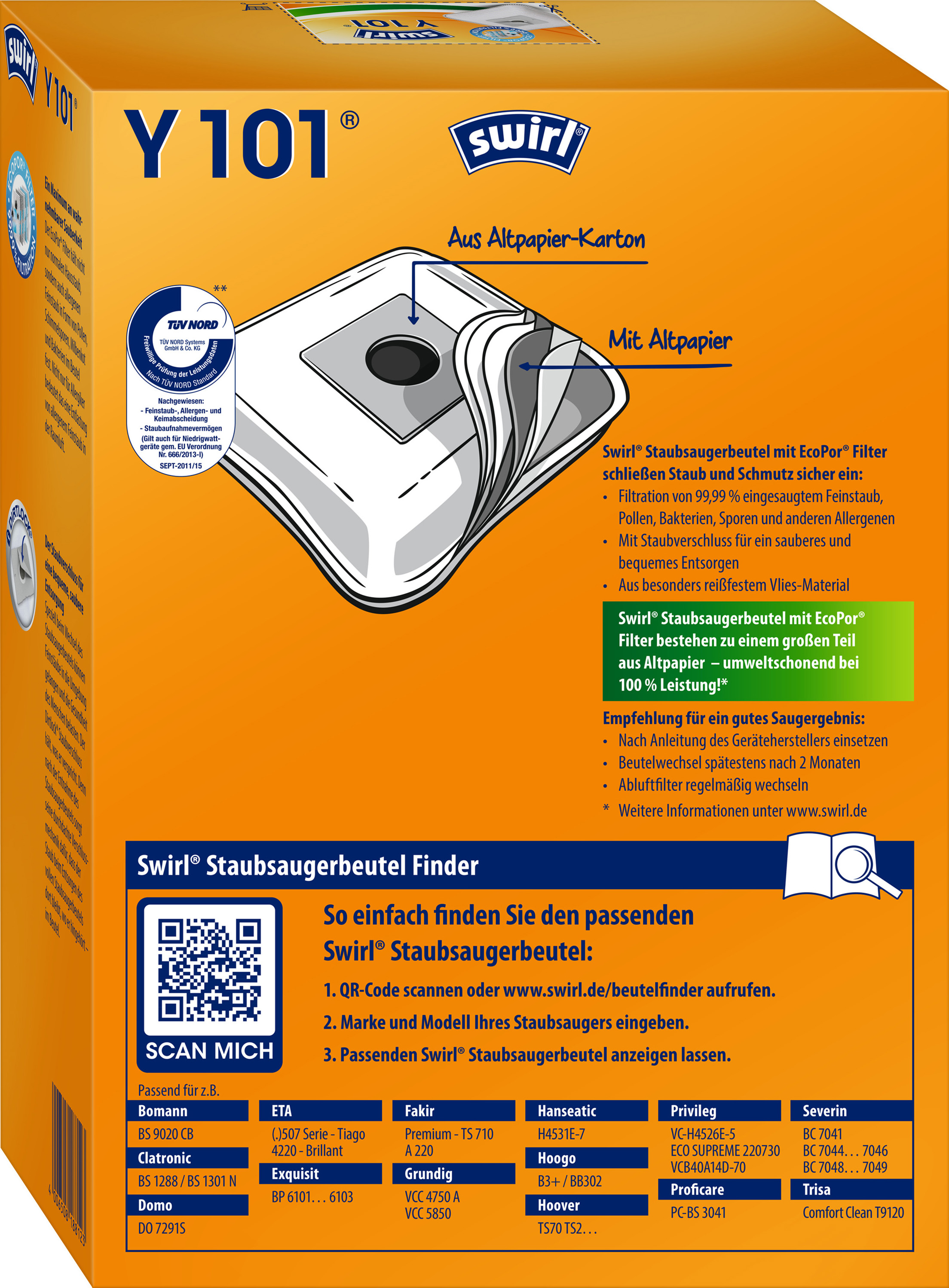 Swirl® MicroPor® Plus Green Staubsaugerbeutel mit erhöhtem Anteil an recycelten Materialien und nachwachsenden Rohstoffen, ressourcenschonend durch den Einsatz von bis zu 65 % Recyclingmaterial und nachwachsenden Rohstoffen (je nach Staubsaugerbeuteltyp), MicroPor® Plus Filtration mit Anti-Allergen-Filter hält nicht nur normalen Hausstaub, sondern auch allergenen Feinstaub im Beutel fest, praktischer Dirtlock® Staubverschluss für eine bequeme, staubfreie Entsorgung des vollen Staubsaugerbeutels, Feinstaub-, Allergen- und Keimfiltration sowie Staubaufnahmevermögen vom TÜV NORD zertifiziert - auch für Niedrigwattgeräte gem. EU Verordnung Nr. 666/2013-I, Swirl® MicroPor® Plus Staubsaugerbeutel werden zu 100 % in Deutschland gefertigt, Verpackung zu 100 % aus Altpapier und vollständig recycelbar, optimale Passform und lange Nutzungsdauer dank abgerundeter Ecken und Volumen-Staubspeicher, jede Verpackung mit praktischer Einkaufshilfe, geeignet für übrige Marken Staubsauger