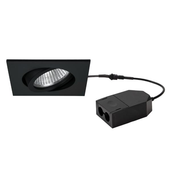 LED-Einbaustrahlerset, Phasenabschnitt dimmbar, strukturschwarz, quadratisch. Ausgeführt in kompakter Bauform für werkzeuglose Schnellmontage zum Deckeneinbau. Set inkl. Konverter für 230 V-Netzspannung, Phasenabschnitt dimmbar, Maße Konverter: L 80 x B 45 x H 23 mm (Konvertergehäuse auch aus Ocean Plastic Material) Ausführung: ohne Fassung, Montageart: Einbaumontage, Montageort: Deckenmontage, Material: Nylon / Magnesiumhydroxid / Fiberglas, Schutzart raumseitig: nach DIN EN 60529: IP20, Schutzklasse: (EN 61140) II, Spannung: 230V AC 50Hz, Leistung: 5 W, Anzahl der Leuchtmittel / Fassungen: 1 Stück, Lichtstrom: 410 lm, Farbtemperatur: 3.000 K, Abstrahlwinkel: 38°, Verstellbarkeit: schwenkbar, Mit Betriebsgerät: Ja, Dimmbar: Ja, Art der Dimmung: Phasenabschnitt.