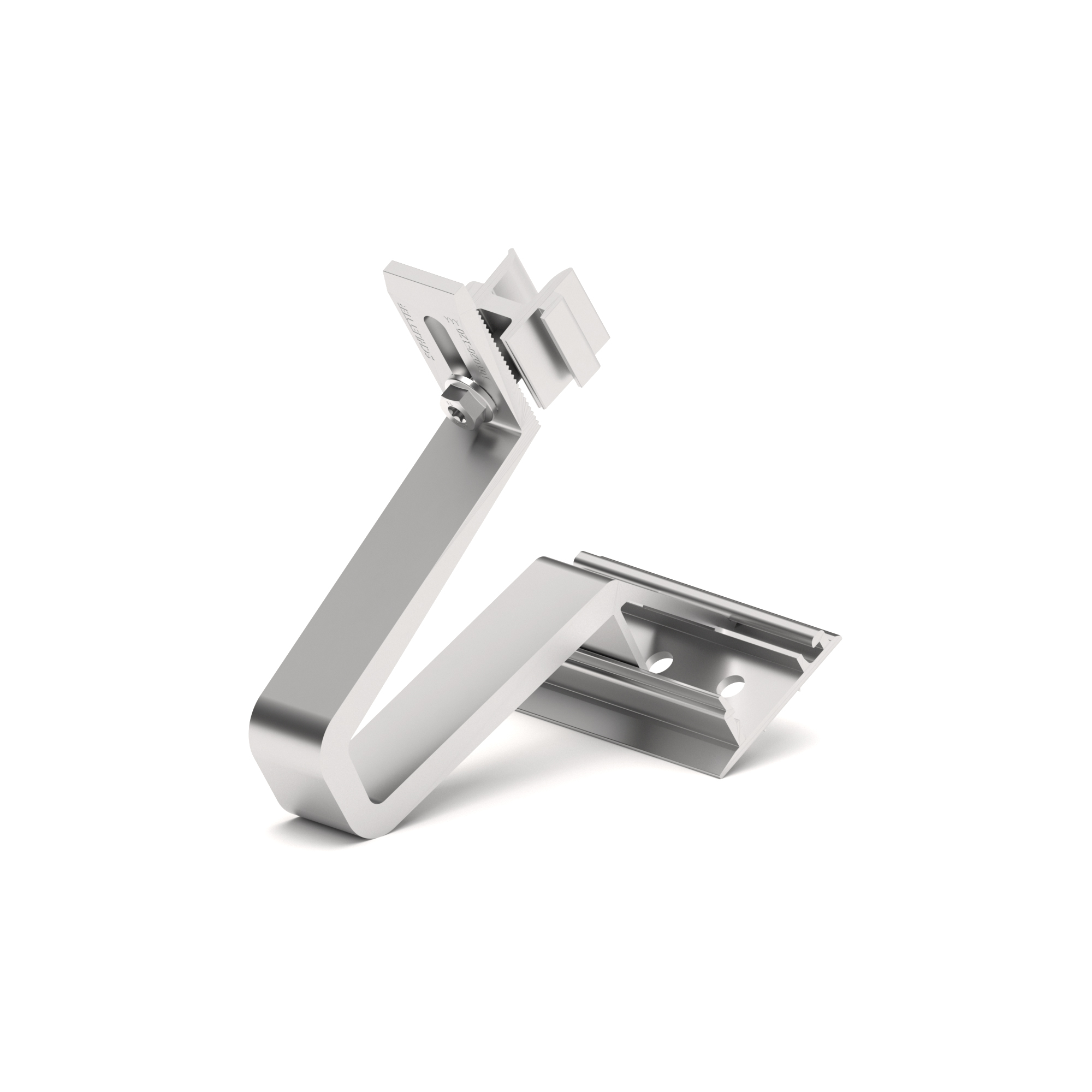Der Dachhaken aus Aluminium deckt einen Großteil der Anwendungen auf Ziegeldächern ab und ist für höhere Schneelaste und Windlasten geeignet. Er ermöglicht eine schnelle und flexible Montage durch Einhaken, und wird mit nur einer Tellerkopfschraube mit TX befestigt. Es wird die Anschraubplatte am Sparren montiert und der Bügel wird anschließend eingeklickt. Durch einen drehbaren Multiadapter kann der Dachhaken mit den Profilen der Serie ProLine sowie mit dem klassischen Schletter Baukastensystem kombiniert werden und besitzt am oberen Anschluss eine Höhenverstellung sowie einen entsprechenden Schnellmontageadapter.