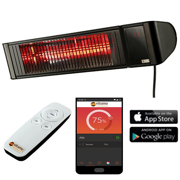 Als Hellstrahler mit einem sichtbar glühendem Heizmedium werden die Infrarot-Heizstrahler als Wärmequelle überall im Freien beispielsweise auf der Terrasse oder Balkon eingesetzt. Gerade im Frühjahr und Herbst, wenn die Umgebungstemperatur noch mehr als 15 °C beträgt, entsteht im Wirkungsbereich des Strahlers auf ca. 8-12m² eine angenehme lokal-empfundene Behaglichkeit. Aufgrund der hohen Quelltemperatur erreichen Hellstrahler einen sehr hohen Strahlungswirkungsgrad. Dabei wird die erforderliche Wärmemenge ganz einfach per Bluetooth App oder Infrarot Fernbedienung reguliert. Mit der kostenlosen Smartphone App für iOS und Android ist der Heizstrahler stufenlos von 0 - 100% per touch dimmbar. Die Infrarot-Fernbedienung schaltet neben Ein/Aus das Gerät in sechs fein abgestimmten Heizstufen. Darüber hinaus können über Bluetooth App und Fernbedienung auch mehrere Infrarot-Heizstrahler (bis zu 6 Stück) parallel gesteuert werden. Das Heizgerät verfügt über einen eingebauten Ein/Aus-Hauptschalter am Gehäuse. Das Gehäuse, Farbe schwarz besteht aus hochwertigem Aluminium. Die eingebaute Halogenlampe sorgt neben der intensiven Strahlungswärme durch den Low Glare-Effekt immer noch für ein angenehmes Licht. Der schwenkbare Heizstrahler der Baureihe VC-EH2000S ist für die waagerechte Aufputz-Montage an der Wand geeignet. Schutzart: IP 65. Im Lieferumfang sind ein Montage-Set mit Montageanleitung sowie eine Fernbedienung und 2 x AAA (1,5 V) Batterien enthalten.- Hersteller-Artikelnummer (MPN)