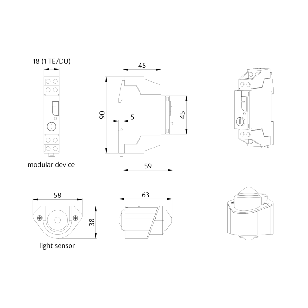 Dämmerungsschalterset für die Hutschiene, LED-Einstellhilfe (verzögerungsfrei) zur Einstellung der Einschaltschwelle, Elektronikteil für Verteiler-Einbau zur bequemen Einstellung im Schaltschrank, Ausschaltung bei ca. 1,3-fachem Einschaltwert, Separater Lichtfühler für Aufbau- oder Einbaumontage (im Lieferumfang)
