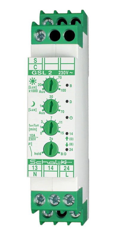 Der GSL 2 ist ein universell einsetzbarer Grenzwertschalter für die Helligkeitsüberwachung. Mit zwei separaten Einstellbereichen von 1-70 Lux bei der Dämmerungsüberwachung und 20.000-100.000 Lux bei der Beschattungsüberwachung können verschiedenste Anwendungen (Steuerung von Beschattungsanlagen, helligkeitsabhängige Rolladen-/Jalousiesteuerung, einfache Lichtsensorauswertung von nachgeschalteten Steuerungen wie SPS, etc.) realisiert werden. Durch 2 Betriebsarten und einen automatisch erzeugten Gegenlaufimpuls ist eine schnelle und einfache Integration in einer Vielzahl von Anlagen gewährleistet. Der passende Lichtsensor SL 2 wird potentialfrei durch den GSL 2 versorgt (3.3V DC PELV), somit wird kein externes Netzteil benötigt., Maße: 18x55mm, 230V AC