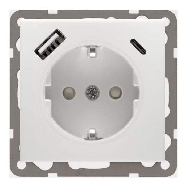 Steckdose mit USB Ladegerät 3,4A, USB Typ A+C (QC3.0) 2-polig, 16A 250 V~, mit Verbindungsklemmen nach VDE 0620, mit Zentralplatte für Kombinationen, mit 2 USB-Ports Typ A und Typ C zum Versorgen und Aufladen von mobilen Geräten. USB-Ausgangsspannung DC 5V, Ladestrom max. 3A (Max. 15W) USB Typ C (QC3.0) Betrieb (ohne USB Typ A): USB-Ausgangsspannung DC 9V, Ladestrom max. 2A (Max. 18W) USB-Ausgangsspannung DC 12V, Ladestrom max. 1,5A (Max. 18W) USB Typ A+C (Parallelbetrieb): USB-Ausgangsspannung DC 12V, Ladestrom max. 3,4A (Max. 17W) mit Ladestromüberwachung Umgebungstemperatur: 0°C bis +35°C Lager- / Transporttemperatur: -10°C bis +60°C, Anschlussart: Steckklemme Eindrähtig: 1,5x2,5 mm², Verwendung tiefer Unterputzdosen empfohlen