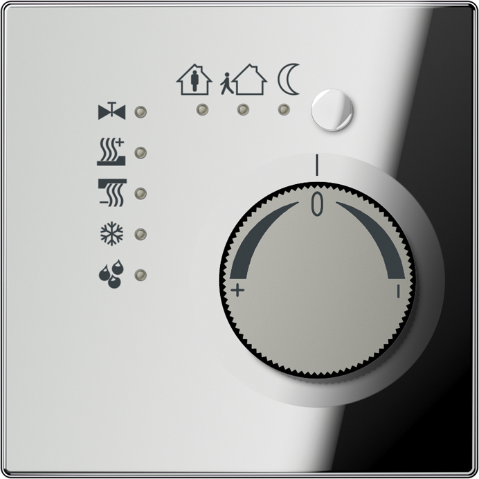 Produkteigenschaften Integrierter Busankoppler Messung der Raumtemperatur und Vergleich mit Soll-Temperatur Sollwert-Vorgabe durch Wahl der Betriebsart Betriebsarten Komfort, Standby, Nachtbetrieb, Frost-/Hitzeschutz Heiz- und Kühlbetrieb Heizen und Kühlen mit Grund- und Zusatzstufe Stellrad zur Sollwert-Korrektur Präsenz-Taste Status-LEDs Tasterschnittstelle mit vier Eingängen oder zwei Ausgängen und zwei Eingängen, z.B. für Fensterkontakte, Taster, LED etc. Funktion der Eingänge: Schalten, Dimmen, Jalousiesteuerung, Lichtszenen-Nebenstelle, Helligkeits- oder Temperatur-Wertgeber Optional: Externer Temperaturfühler anschließbar (Art.-Nr.: FF NTC) KNX Medium: TP 256 Nennspannung KNX: DC 21 ... 32 V SELV Stromaufnahme KNX: max. 10 mA Anschluss KNX: Anschlussklemme Umgebungstemperatur: -5 ... +45 °C Lager-/Transporttemperatur: -25 ... +70 °C