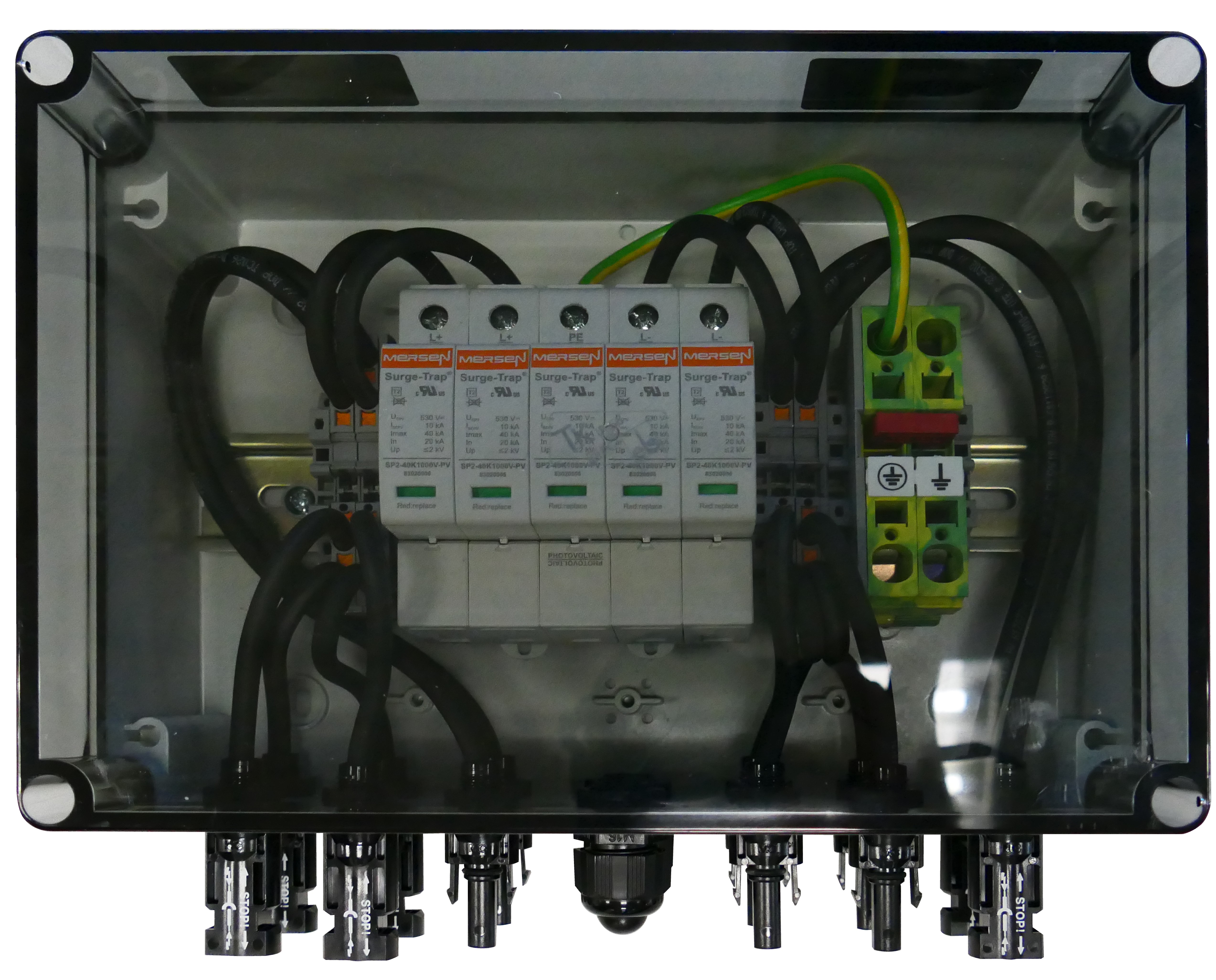 DC PV Junction Boxes ist eine Serie von DC Photovoltaik Generator Anschlusskästen zum Schutz der Umrichter nach IEC/EN vor Blitz- und Überspannungen. Die Boxen sind vorinstalliert und werden parallel zu den Umrichtern, hauptsächlich für 1000Vdc Dachinstallationen, eingesetzt. Verfügbar sind die Boxen in unterschiedlichen Konfigurationen, z.B mit Typ 1+2 oder Typ 2 Ableitern, Kabelverschraubungen oder MC4 - teckern und für eine unterschiedliche Anzahl an MPPTs und Strings.