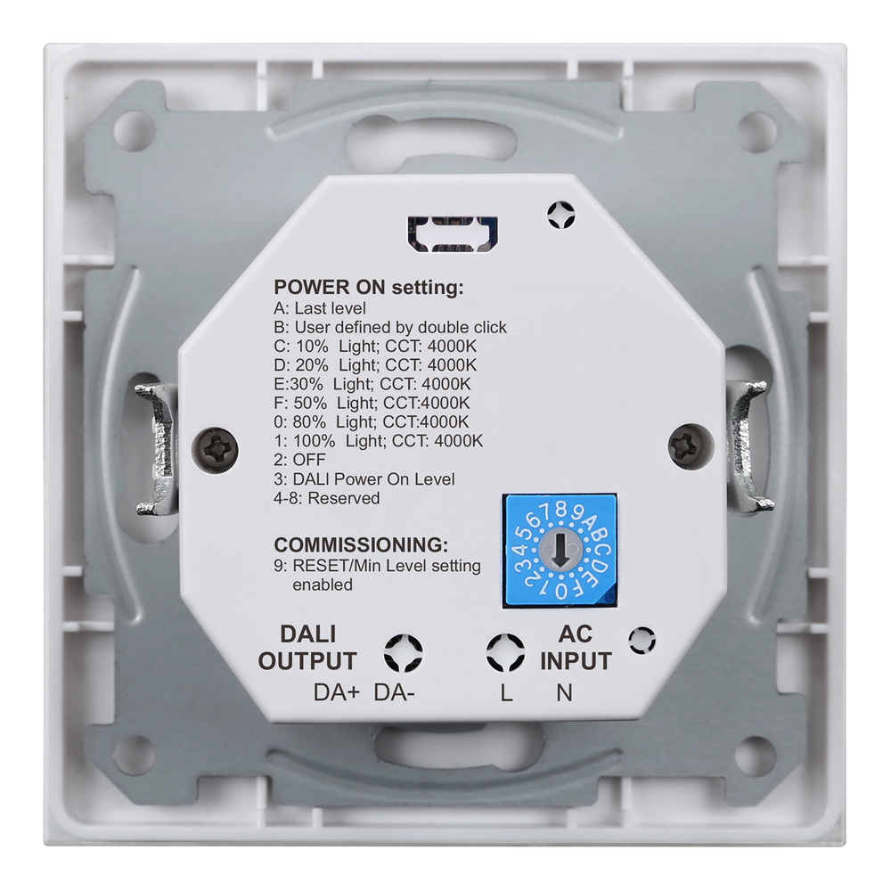 Manuelles Steuergerät für bis zu 25 Lichtprodukte, Tunable White Lichtfunktion, austauschbare Tasterabdeckung. Produkteigenschaften: DALI-2 Steuergerät für Montage in handelsüblichen Unterputzdosen. Drehknopf für manuelle Lichtsteuerung. Bis zu 4 Steuergeräte zum Aufbau mehrerer Bedienstellen parallel schaltbar. Automatische Synchronisation zwischen den Bedienstellen. Anzahl DALI Leuchten pro Steuergerät: bis zu 25. Leitungslänge der DALI-Steuerleitung: bis zu 300 m. Produktvorteile: Einfache, intuitive Bedienung. Manuelles Dimmen, Schalten und Speichern von Lichteinstellungen. Individuelle Einstellung der Helligkeitsstufe und der Farbtemperatur. Austauschbare Frontabdeckung mit kompatiblem Tasterabedeckungen von BUSCH-JÄGER, GIRA, JUNG, SCHNEIDER, BERKER, SIEMENS. Verhalten nach Netzunterbrechung einstellbar. Netzspannungsbetrieb (aktiver Modus) oder DALI Bus Spannungsversorgung (passiver Modus). Optionaler Rahmen für Aufputzmontage verfügbar. Kompatibel mit LEDVANCE VIVARES DALI Lichtmanagementsystem (LEDVANCE DALI Leuchten). Anwendungsgebiete: Einraumlösung mit bis zu 4 Ein-/Ausgängen. Meeting- und Konferenzräume. Restaurants. Shopbeleuchtung. Private Wohnbereiche.