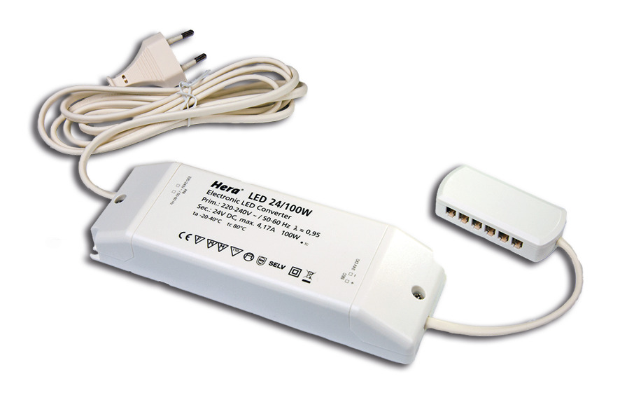Elektronischer Sicherheitstransformator 24V DC, Netzanschlussleitung 2 m mit Eurostecker, 12-fach Verteiler, max. zulässige Länge der Sekundärleitungen 5 m