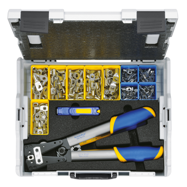 Aus stoß- und schlagfestem ABS-Kunststoff hergestellt. Sehr robust, belastbar bis 100 kg. Über ein Easy-Klick-System stapelbar, das sich leicht öffnen und schließen lässt. Lieferumfang: Presswerkzeug für Rohrkabelschuhe und Verbinder Normalausführung 6 - 50 mm² (K05) 1 Stück, Hand-Schneidwerkzeug für Al- und Cu-Kabel bis Durchmesser 14 mm (K100) 1 Stück, Kabelmesser, ohne Klinge 4 - 16 mm (KL740416) 1 Stück, Rohrkabelschuh ohne Sichtloch, 6 mm², M6, Cu verzinnt (1R6) 25 Stück, Rohrkabelschuh ohne Sichtloch, 6 mm², M8, Cu verzinnt (1R8) 25 Stück, Rohrkabelschuh ohne Sichtloch, 10 mm², M6, Cu verzinnt (2R6) 25 Stück, Rohrkabelschuh ohne Sichtloch, 10 mm², M8, Cu verzinnt (2R8) 25 Stück, Rohrkabelschuh ohne Sichtloch, 16 mm², M10, Cu verzinnt (3R10) 25 Stück, Rohrkabelschuh ohne Sichtloch, 25 mm², M8, Cu verzinnt (4R8) 20 Stück, Rohrkabelschuh ohne Sichtloch, 25 mm², M10, Cu verzinnt (4R10) 20 Stück, Rohrkabelschuh ohne Sichtloch, 35 mm², M8, Cu verzinnt (5R8) 20 Stück, Rohrkabelschuh ohne Sichtloch, 35 mm², M10, Cu verzinnt (5R10) 20 Stück, Rohrkabelschuh ohne Sichtloch, 50 mm², M10, Cu verzinnt (6R10) 15 Stück, L-BOXX mit Frontgriff (B/T/H: 442 x 357 x 117 mm) (LBOXX102LFG) 1 Stück.