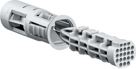 Mini-Geräteträger mit 4 Schwenkschneiden und 2 Klemmrippen (1159-50). Mini-Geräteträger für die nachträgliche Befestigung verschiedenster Anbaugeräte an gedämmten und bereits verputzten Wärmedämmverbundsystemen (WDVS). Dauerhaft sicher und ohne Wärmebrücken können Leuchten, Bewegungsmelder, Außenfühler und vieles mehr schnell und einfach befestigt werden. Länge: 60 mm | Anwendungsgebiet: Installation an oder in der gedämmten Außenfassade | Einbauöffnung: Ø 20 mm
