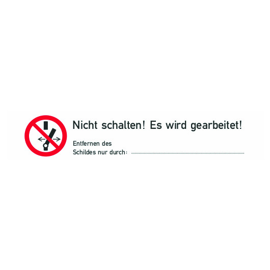 Warnaufkleber "Nicht schalten! Es wird gearbeitet!" Material: selbstklebende Folie, wiederablösbar. Format: 80x16 mm. Gestalt.: Symbol gemäß ASRA 1.3 (2013)DIN EN ISO 7010, P031. Lieferung erfolgt auf Bogen liegend zu 10 Stück.