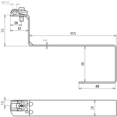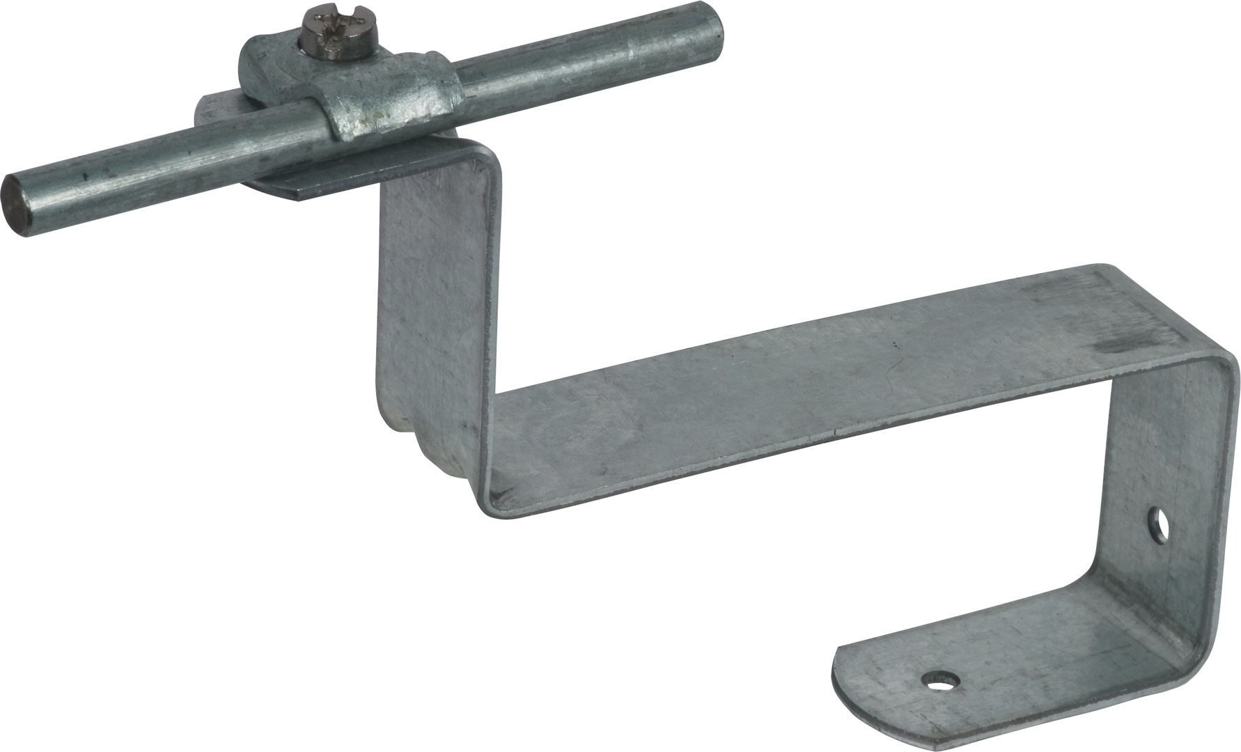 Dachleitungshalter mit gewinkelter Strebe zur Befestigung von Fang- und Ableitungen für Dachflächen. Ausführung zum Einhängen in die Dachziegel / Dachsteine oder die Dachlattung, mit Leitungshalter DEHNQICK und fester Leitungsführung längs oder quer.