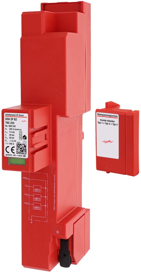 Geprüfter Kombi-Ableiter Typ 1+Typ 2+Typ 3 nach DIN EN 61643-11 für TN-C-Systeme (3+0-Schaltung); komplett werkzeuglos montierbar durch Click+Power-Anschlusstechnik für das 40 mm Sammelschienensystem und Push-in Erdungsklemme; Zum Einsatz im Hauptstromversorgungssystem nach DIN VDE 0100-443 bei Gebäuden (auch mit Freileitungseinspeisung, ohne äußeres Blitzschutzsystem). Ein passender Abdeck-Clip nach DIN VDE 0603-1 für jedes handelsübliche Zählerfeld ist im Lieferumfang enthalten.