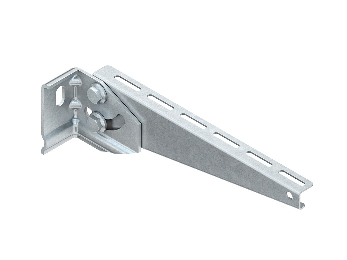 Wandausleger, verstellbar, Verstellbereich +25° bis -60°, zur Befestigung an schrägen Wänden, im Bereich z. B. von Betonröhren und Tunnel, einschließlich feuerverzinkten anteilmäßigem Befestigungszubehör. Die Tragfähigkeitsangaben gelten nur bei ausreichender Verankerung mit dem tragenden Untergrund und einem auf die Schrauben aufgebrachten max. Anzugsdrehmoment von 123 Nm. Bitte beachten: Der zum Einsatz kommende Ausleger, bei einer Neigung des Auslegeranschlusswinkels bis 60°, richtet sich nach der zur schrägen Decke/Wand verfügbaren Höhe und der benötigten Breite der Kabelrinne. Abmessungen (ca. Maße) Auflagehöhe H : 94 mm Breite des Anschlusswinkels B : 52 mm Gesamtbreite B1 : 76 mm Auflagelänge L : 365 mm Gesamtlänge L1 : 390 mm Tragfähigkeit F bei L/2 : 1,5 kN im System geprüft Werkstoff Ausleger : Stahl, tauchfeuerverzinkt nach DIN EN ISO 1461