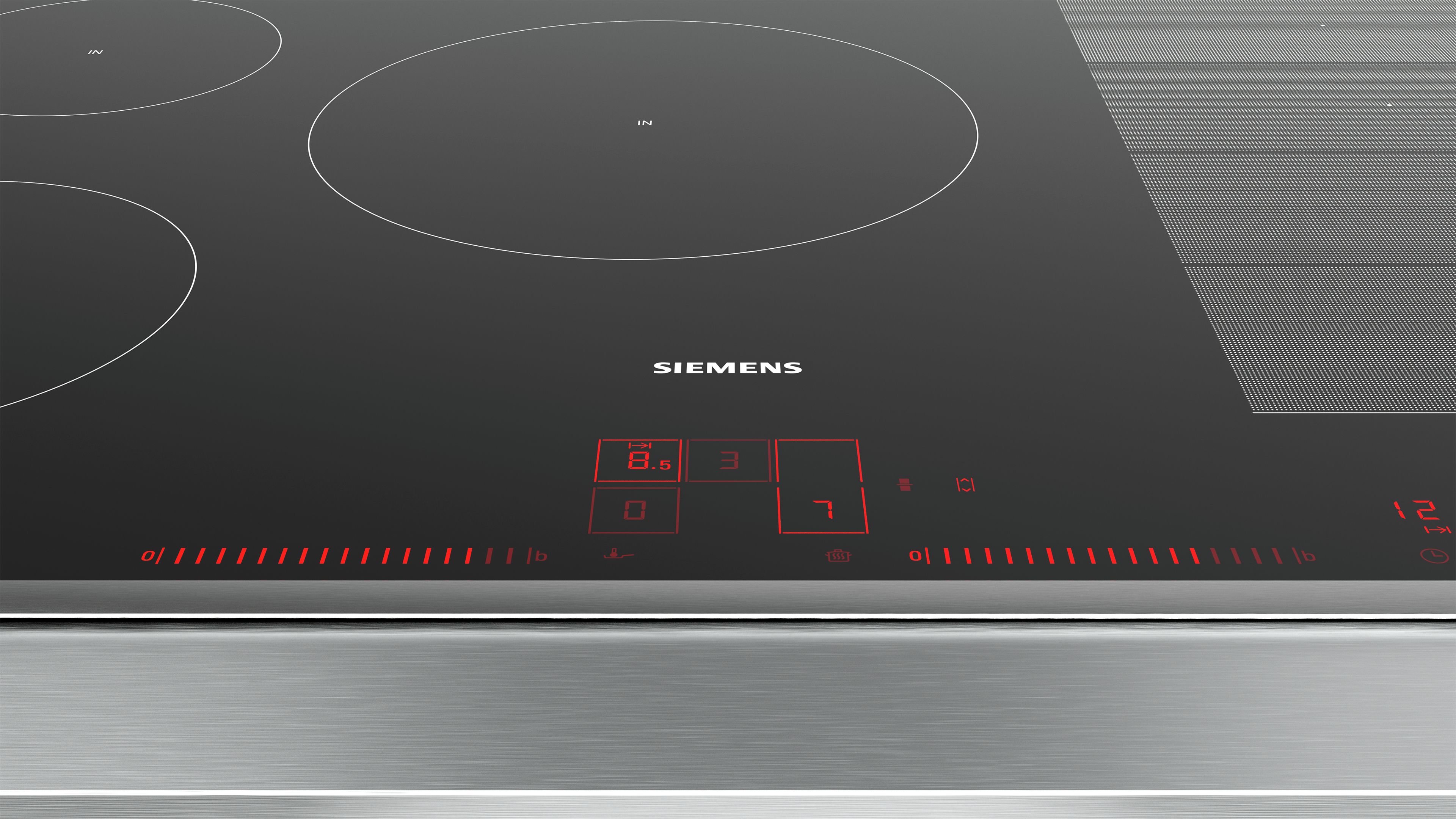 80 cm: Platz für 5 Töpfe oder Pfannen Flexibilität der Kochzonen 1 varioInduktions-Kochzone: Verwenden Sie Kochgeschirr beliebiger Form und Größe innerhalb der 40 cm langen Zone. Kochzone vorne links: 180 mm, 1.8 kW (maximale Leistung 3.1 kW) Kochzone hinten links: 145 mm, 1.4 kW (maximale Leistung 2.2 kW) Kochzone hinten: 240 mm, 2.2 kW (max. Leistung 3.7 kW) Kochzone hinten rechts: 210 mm, 190 mm, 2.2 kW (maximale Leistung 3.7 kW) Kochzone vorne rechts: 210 mm, 190 mm, 2.2 kW (maximale Leistung 3.7 kW) Benutzerfreundlichkeit Dual LightSlider-Bedienung: Steuern Sie die Leistung direkt über die beiden beleuchteten Touchleisten (im ausgeschalteten Zustand unsichtbar). 17 Leistungsstufen: Stellen Sie die Hitze mit 17 Leistungsstufen (9 Hauptstufen und 8 Zwischenstufen) präzise ein. Warmhaltefunktion: Warmhalten von Speisen bei voreingestellter niedriger Leistungsstufe. Timer mit Abschaltfunktion: Schaltet die Kochzone am Ende der eingestellten Zeit aus (z. B. bei gekochten Eiern). Timer: Am Ende der eingestellten Zeit ertönt ein Signal (z. B. beim Pastakochen). Laufzeitanzeige: zeigt an, wie viel Zeit seit dem Starten des Timers vergangen ist (z. B. beim Kochen mit Kartoffeln). Zeitersparnis und Effizienz powerBoost-Funktion für alle Induktions-Kochzonen möglich: Mit 50 % mehr Leistung z. B. Wasser schneller zum Kochen bringen als auf höchster Leistungsstufe. powerBoost-Funktion für Pfannen: Erhitzt Pfannen schneller als auf höchster normaler Leistungsstufe und schützt gleichzeitig die Pfannenbeschichtung. powerMove Plus: erhöht oder verringert die Leistung einfach durch Verschieben des Topfes nach vorne, in die Mitte oder nach hinten. quickStart: Beim Einschalten wählt das Kochfeld automatisch die Kochzone aus, auf dem im ausgeschaltetem Zustand Kochgeschirr aufgesetzt wurde. reStart: Im Falle von unbeabsichtigtem Ausschalten des Kochfeldes bleiben alle Einstellungen erhalten, wenn Sie innerhalb von 4 Sekunden wieder einschalten. Kochunterstützung Bratsensor Plus mit 5 Temperaturstufen: Verhindert ein Anbrennen durch die automatische Temperaturregelung des Sensors. Design Flachrahmen-Design Sicherheit 2-stufige Restwärmeanzeige je Kochzone: Zeigt an, welche Kochzonen noch heiß oder warm sind. Kindersicherung: Verhindert eine unbeabsichtigte Aktivierung des Kochfeldes. Wischschutzfunktion: Übergekochte Flüssigkeiten abwischen, ohne die Einstellungen unbeabsichtigt zu ändern (30 Sekunden sind alle Touch-Tasten blockiert). Hauptschalter: Alle Kochzonen auf einmal ausschalten. Automatische Sicherheitsabschaltung: Aus Sicherheitsgründen schaltet sich das Kochfeld nach einer voreingestellten Zeit ohne Interaktion automatisch ab. Energieverbrauchsanzeige: Zeigt den Stromverbrauch des letzten Kochvorgangs an. Installation Maße des Gerätes (HxBxT mm): 55 x 795 x 517 Erforderliche Nischengröße (HxBxT mm): 55 x 780 x (500 - 500) Minimale Arbeitsplattenstärke: 16 mm Gesamtanschlusswert: 7400 W powerManagement Funktion: Bei Bedarf die maximale Leistung begrenzen (abhängig von der Absicherung der Elektroinstallation). Netzkabel: 110 cm, Anschlusskabel beigelegt in Verpackung