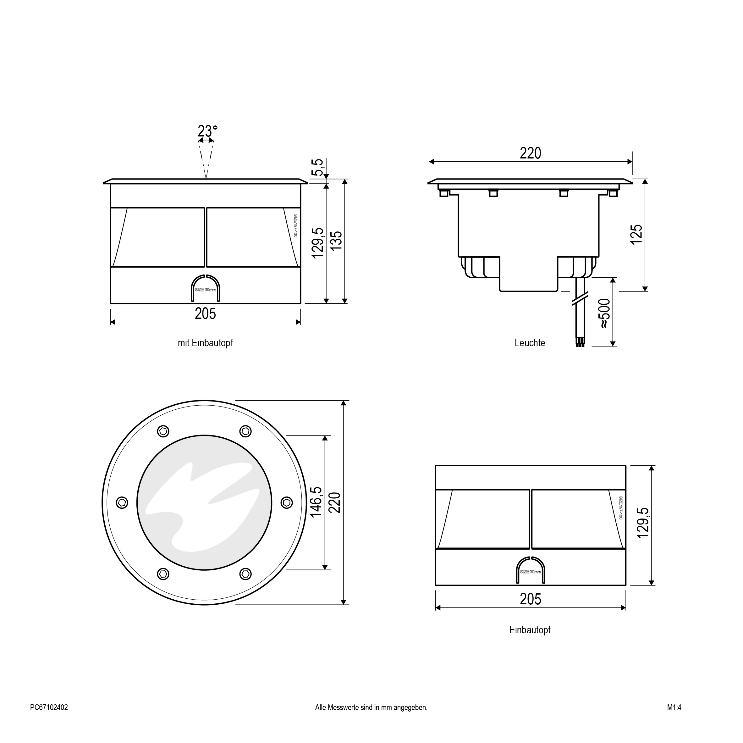 Der Leuchtenkörper der Bodeneinbauleuchte ist aus massivem Aluminium gefertigt, der obere Abdeckring hingegen aus V2A-Edelstahl und kann für vielfältige Anwendungen im Außenbereich verwendet werden. Die Montage erfolgt mittels der im Lieferumfang befindlichen Kunststoff-Einbauhülse. Da der COB-LED-Chip fest verbaut ist, fallen keine zusätzlichen Kosten für Leuchtmittel an. Ebenso entstehen auch keine zusätzlichen Kosten für ein Vorschaltgerät, da der Anschluss direkt an die 230V-Zuleitung erfolgt. Die maximale Überfahrgeschwindigkeit beträgt 20km/h. Optional sind für die Leuchte ein mattes Glas, sowie ein Blendschutz erhältlich. Die Leuchte hat eine 0,50m lange Anschlussleitung (ÖLFLEX CLASSIC 110 BLACK 3 x 0,75mm²) mit freien Aderenden.