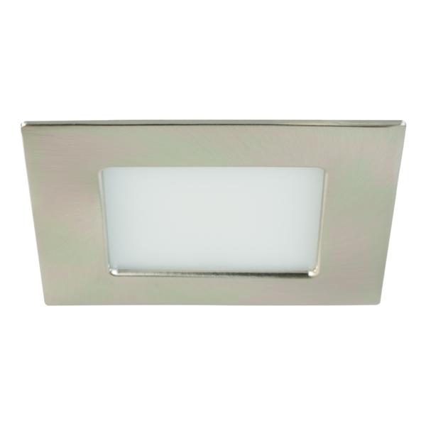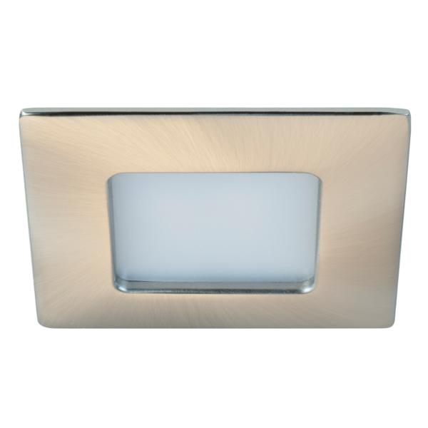 LED-Einbaudownlight, IP44, nickel matt, quadratisch. Ausgeführt in kompakter Bauform für werkzeuglose Schnellmontage zum Deckeneinbau. Leuchte optimiert zur Installation in Möbeln und Holzwerkstoffen. Montageart: Einbaumontage, Montageort: Deckenmontage, Material: Zink-Druckguss / Kunststoff, Schutzart raumseitig: nach DIN EN 60529: IP44, Schutzklasse: (EN 61140) III, Spannung: 12V, Leistung: 3 W, Anzahl der Leuchtmittel / Fassungen: 1 Stück, Lichtstrom: 185 lm, Farbtemperatur: 2.900 K, Abstrahlwinkel: 60°, Verstellbarkeit: nicht verstellbar, ohne Betriebsgerät, Dimmbar: Abhängig vom Betriebsgerät, Art der Dimmung: Abhängig vom Betriebsgerät.
