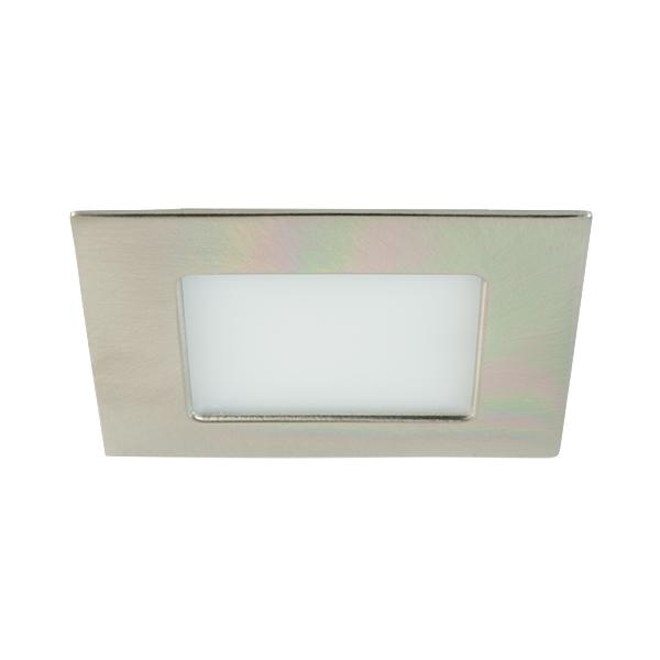 LED-Einbaudownlight, IP44, nickel matt, quadratisch. Ausgeführt in kompakter Bauform für werkzeuglose Schnellmontage zum Deckeneinbau. Leuchte optimiert zur Installation in Möbeln und Holzwerkstoffen. Montageart: Einbaumontage, Montageort: Deckenmontage, Material: Aluminiumdruckguss / Kunststoff, Schutzart raumseitig: nach DIN EN 60529: IP44, Schutzklasse: (EN 61140) III, Spannung: 12V, Leistung: 4,5 W, Anzahl der Leuchtmittel / Fassungen: 1 Stück, Lichtstrom: 355 lm, Farbtemperatur: 2.900 K, Abstrahlwinkel: 60°, Verstellbarkeit: nicht verstellbar, ohne Betriebsgerät, Dimmbar: Abhängig vom Betriebsgerät, Art der Dimmung: Abhängig vom Betriebsgerät.