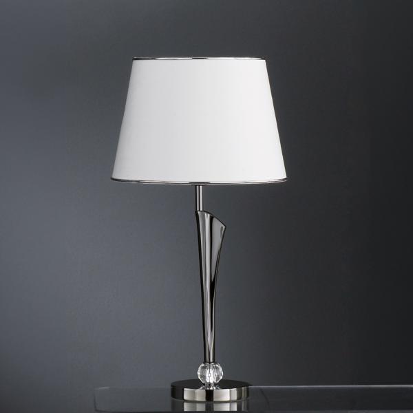 Tischleuchte schwarzchrom glänzend, mit Schirm Moiré Jaquard weiß, schwarzchrom glänzend, rund. Ausführung in kompakter Bauform für die harmonische Implementierung in stimmige, architektonische Raumkonzepte. Tischleuchte, Schirm: Moiré Jaquard weiß. Ausführung: E27, Montageart: Anbaumontage, Montageort: Tischmontage, Material: Messingguss / Kristall / Moiré Jaquard, Schutzart raumseitig: nach DIN EN 60529: IP20, Schutzklasse: (EN 61140) I, Spannung: 230V AC 50Hz, Leistung: 60 W, Anzahl der Leuchtmittel / Fassungen: 1 Stück, ohne Betriebsgerät, Art der Dimmung: sonstige.