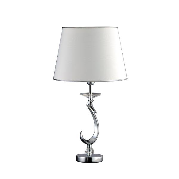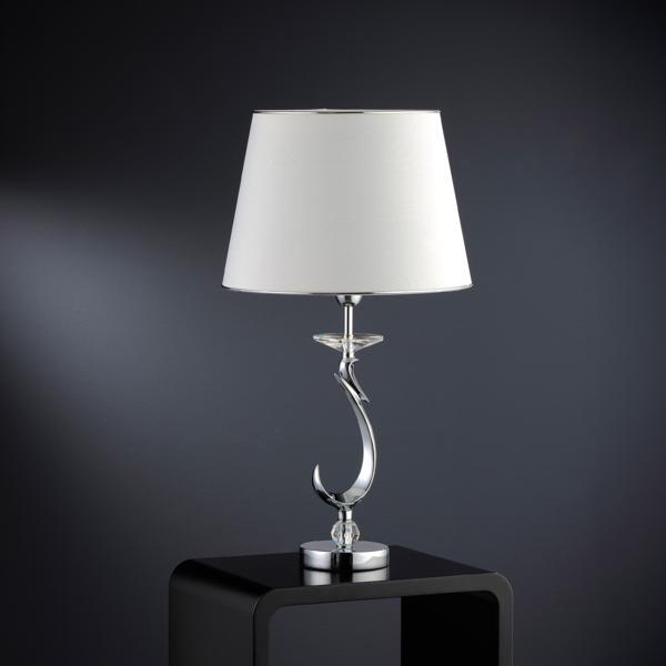 Tischleuchte chrom glänzend, mit Schirm Moiré Jaquard weiß, chrom glänzend, rund. Ausführung in kompakter Bauform für die harmonische Implementierung in stimmige, architektonische Raumkonzepte. Tischleuchte, Schirm: Moiré Jaquard weiß. Ausführung: E27, Montageart: Anbaumontage, Montageort: Tischmontage, Material: Messingguss / Kristall / Moiré Jaquard, Schutzart raumseitig: nach DIN EN 60529: IP20, Schutzklasse: (EN 61140) I, Spannung: 230V AC 50Hz, Leistung: 60 W, Anzahl der Leuchtmittel / Fassungen: 1 Stück, ohne Betriebsgerät, Art der Dimmung: sonstige.