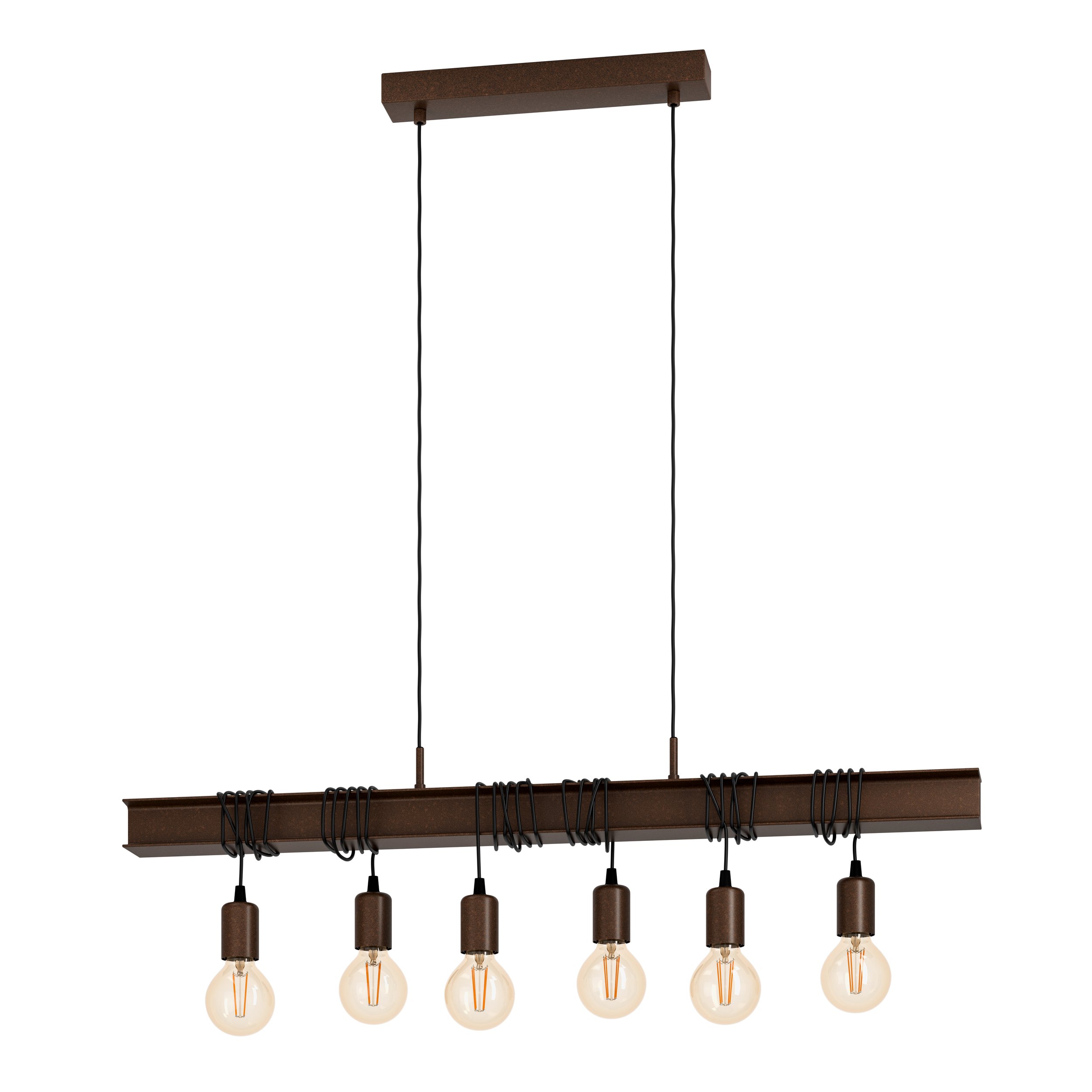 Die Pendelleuchte TOWNSHEND 4 besteht aus einem rostbraunen Metallbalken, der an einen Stahlträger erinnert. Der Metallbalken ist mit sechs abgehängten rostbraunen Lampenfassungen kombiniert, welche dank einfachem Wickeln unterschiedlich hoch gehangen werden können. Die Hängelampe fügt sich nahtlos in die Trends wie Vintage und Industrial ein. Sie bietet einen besonderen Eye-Cathcer in jedem Raum \u2013 egal ob im Wohnzimmer oder im Esszimmer beispielsweise über einem länglichen Esstisch. Die abgebildeten Filament-Leuchtmittel sind nicht im Lieferumfang enthalten. Geeignet ist die Leuchte für jedes Leuchtmittel mit E27-Sockel.