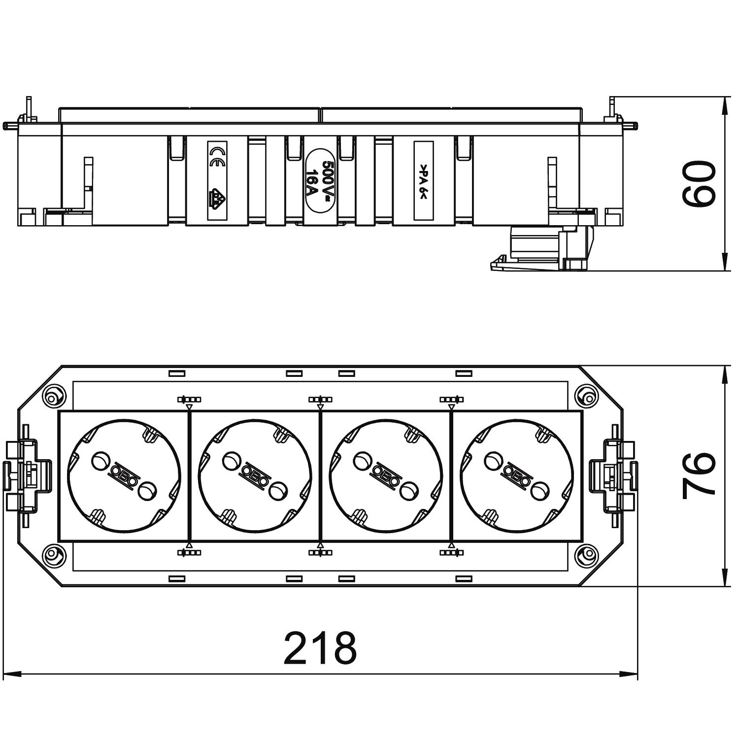 Der anschlussfertige Universalträger UTC4 verfügt über vier vorinstallierte 33° Schutzkontakt-Steckdosen mit 16 A. Passend zu den Verbindungsleitungen VL und den Geräteeinbaueinheiten der Nenngröße R7, R9 und 9.
