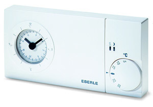 Raumregler 230V mit Uhrenfunktion (Wochenschaltuhr) für Wandbefestigung. Eignet sich für die Regelung von Zentral-, Warmwasserfussboden-, Nachtspeicher, Warmluftheizungen usw.. Einfachste Bedienung durch getrennte Einstellung der Tag- und Nachttemperatur. Zusätzlicher Schalter für 3 Programme unter dem Gehäusedeckel, Tag/Automatik/Nacht. Auswählbares Schaltverhalten, Puls-Weiten-Modulation oder 2-Punkt- Regelverfahren. Einstellbare Zyklusdauer von 10 oder 25 Minuten (Summe von Ein- und Auszeit der Puls-Weiten-Modulation). Gangreserve der Uhr bei Stromausfall ca. 100 Stunden. Bereichseinengung im Einstellknopf als Heizkostenbremse. Schaltuhrausgang zur Ansteuerung weiterer Regler mit Temperatur-Absenkung. 2 Kontroll-Lampen, Heizung Ein und Absenkbetrieb.