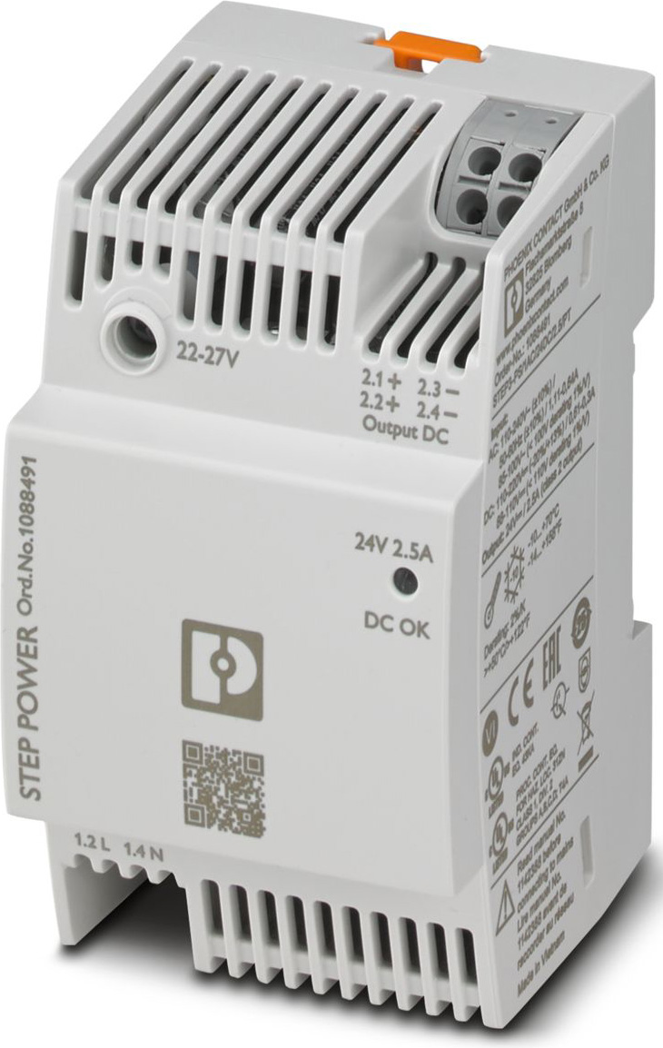 Primär getaktete Stromversorgung, STEP POWER, Push-in-Anschluss, Tragschienen- und Direktmontage, Eingang: 1-phasig, Ausgang: 24 V DC / 2,5 A, einstellbar von 22 V DC ... 27 V DC