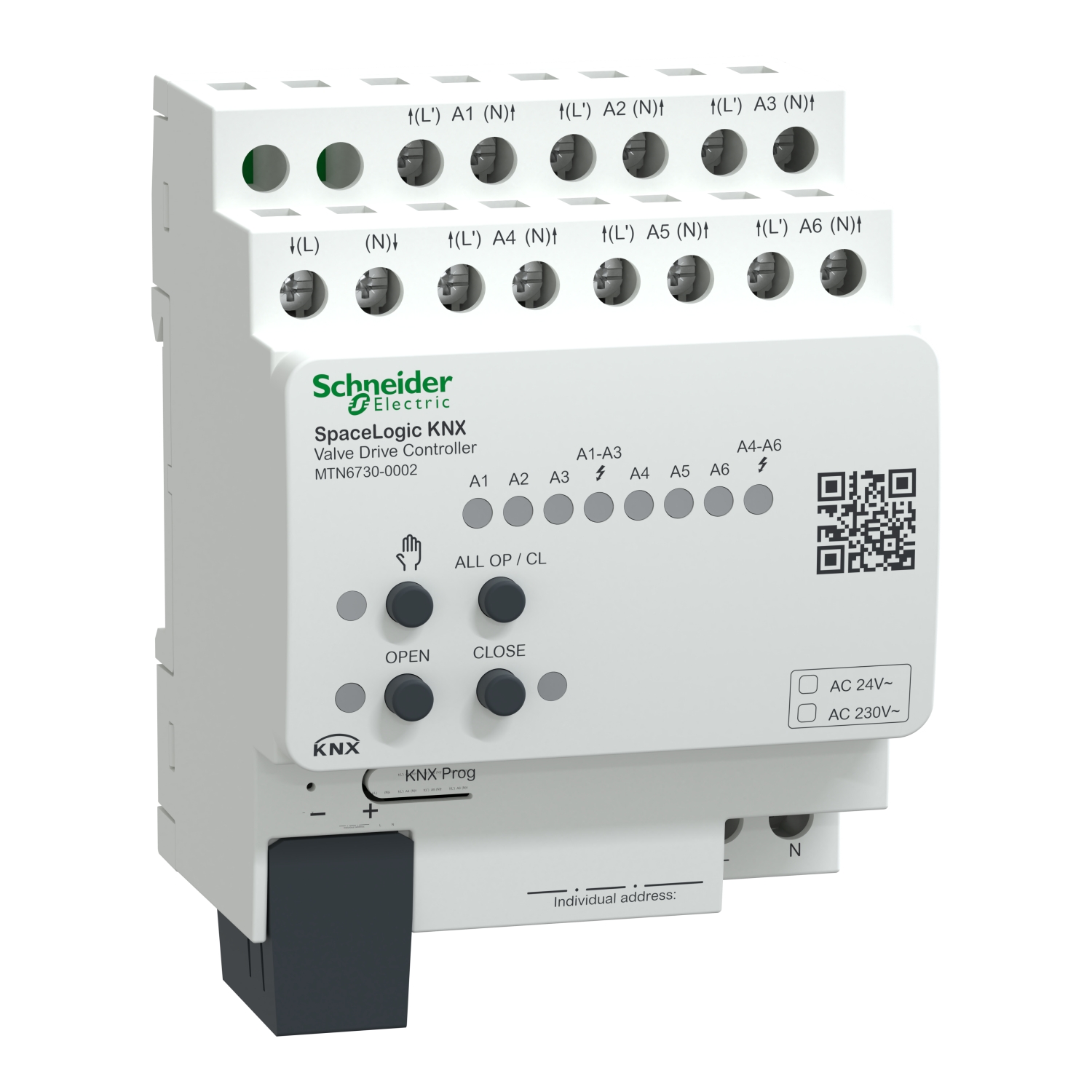 Ventilantriebsaktor mit Regelung, REG. SpaceLogic KNX Ventilantriebsaktor. Zur Ansteuerung von elektrothermischen Ventilantrieben für Heiz- oder Kühldecken. Der Ventilantriebsregler hat 6 elektronische Ausgänge. An jeden Ausgang können bis zu 4 Ventilantriebe (230 V AC) oder 2 Ventilantriebe (24 V AC) angeschlossen werden. Es können sowohl stromlos geschlossene als auch stromlos geöffnete Ventilantriebe angeschlossen werden. Zusätzlich enthält der Ventilantriebsregler 6 integrierte Raumtemperaturregler (RTR), die unabhängig voneinander arbeiten. Die Stellgrößenausgänge dieser RTCs können intern mit den Ventilausgängen verknüpft werden, so dass Temperaturregelung und Ventilsteuerung bei Bedarf nur von einem einzigen Busteilnehmer durchgeführt werden können. In diesem Fall ist kein externer Raumtemperaturregler (z.B. Taster mit RTR) erforderlich. Da die Ventilausgänge einzeln angesteuert werden können, ist auch die Verwendung einer externen RTR jederzeit möglich. Die integrierten Raumtemperaturregler können das Stellgrößentelegramm auf den Bus senden und damit andere Heizungsaktoren oder Fan Coil Aktoren ansteuern. Die Ausgänge sind entweder schalterbetätigt (1 Bit) oder PWM-Signal (1 Byte) aktiviert. Jeder Ausgang ist überlast- und kurzschlussgeschützt. Alle Ausgänge können manuell per Tastenbedienung bedient werden. Baustellenbetrieb ist möglich. Zur Montage auf DIN-Schienen TH35 nach EN 60715. Der Busanschluss erfolgt über eine Busanschlussklemme.