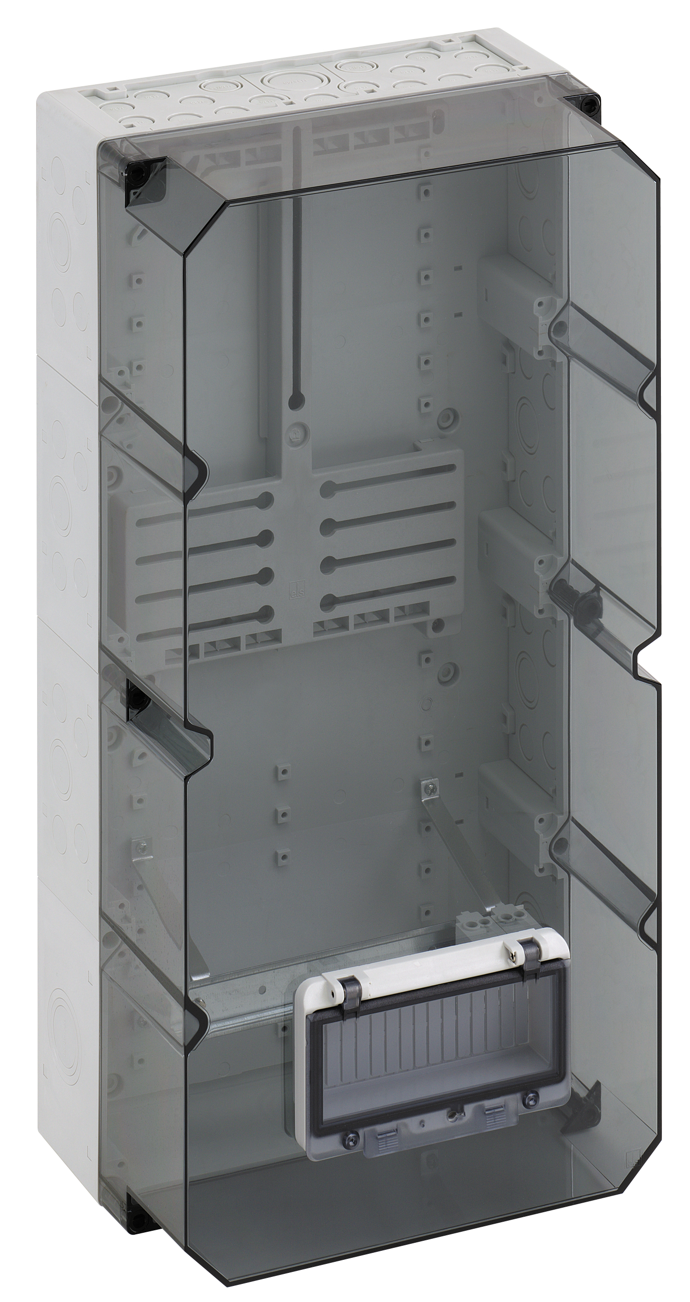 Zählergehäuse, mit transparentem Deckel, serienmäßig plombierbar, mit montiertem Zählerkreuz für Drehstromzähler und Zählerbefestigungsschrauben, mit zusätzlichem Klappfenster zur Bedienung eines selektiven Hauptschalters, mit 35mm Normschiene zum Einbau eines selektiven Hauptschalters, inkl. 2 einpoligen HA-Klemmen 25/16mm² für N und PE, mit Doppelmembranstutzen, Verschluss- und Isolierstopfen, Abmessungen: 300 x 600 x 210mm