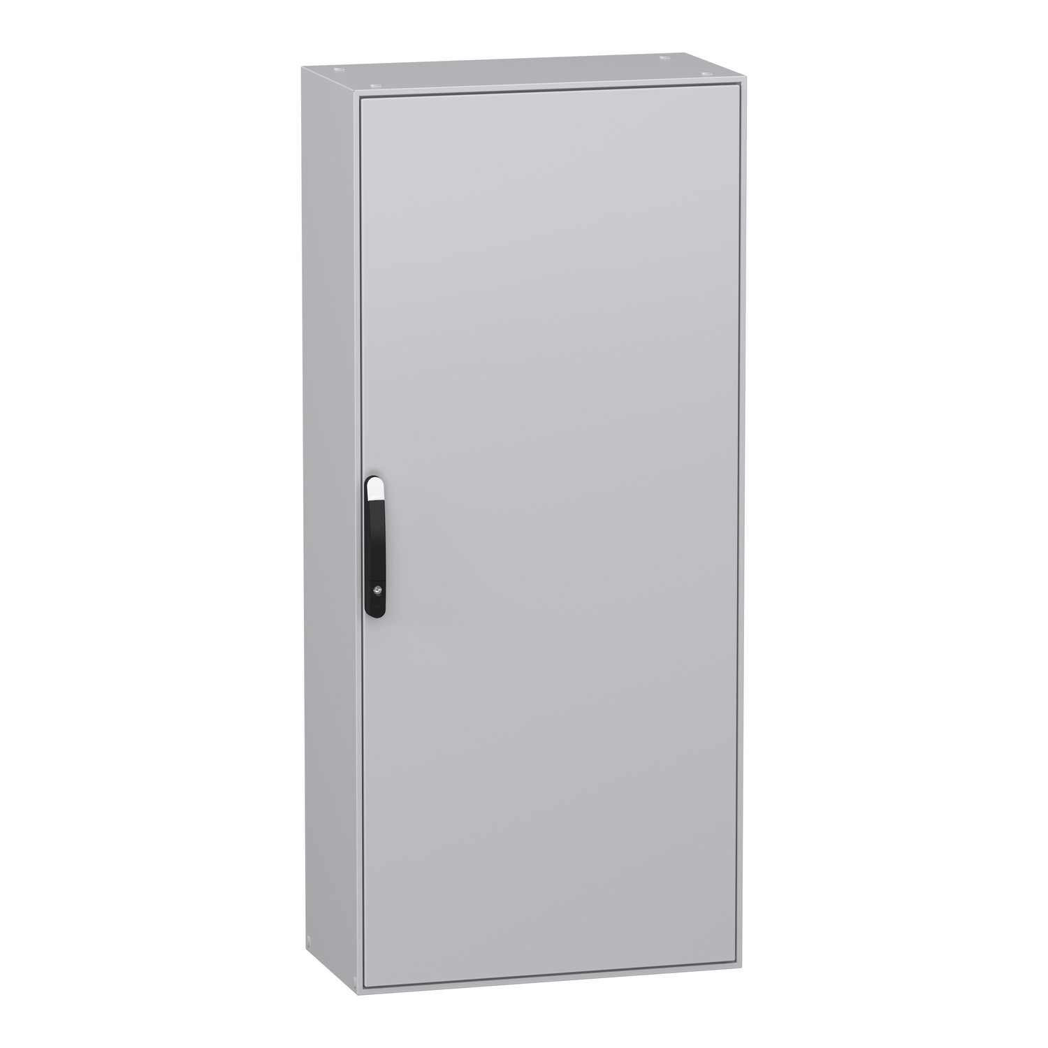 Spacial SM Monoblock-Kompaktgehäuse aus Stahl mit glatter Fronttür. Rückwand geschweißt, inklusive Montageplatte. 4-Punkt-Türverriegelungssystem mit Griff DB 5mm. Stahlblech, verzinkter Stahl für Montageplatte. Schutzart IP 55, IK10, Grau RAL 7035. 4 Montageplattenhalterungen im Lieferumfang enthalten.
