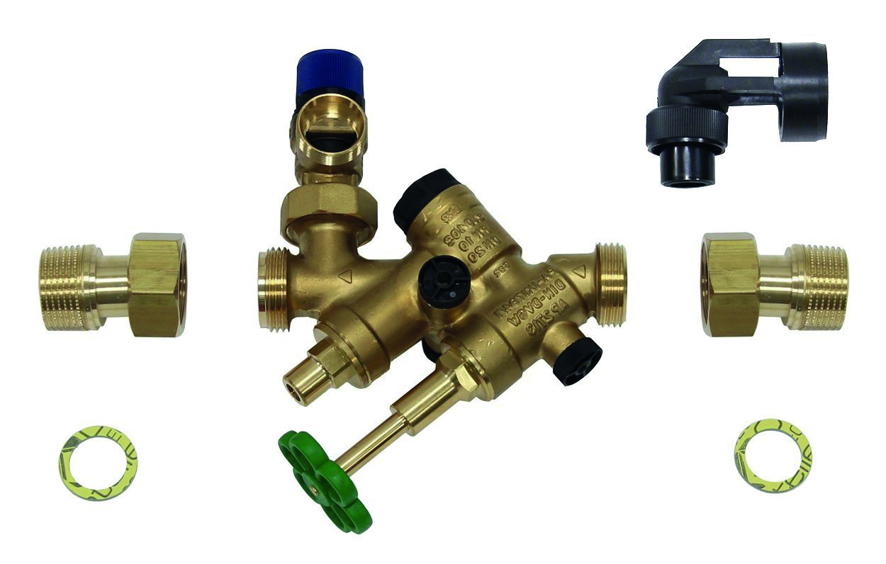 Sicherheitsgruppe für Netzüberdruck unter 4,8 bar, R 3/4 Durchgang, für Speicherinhalt über 200 l bestehend aus: Absperrhahn, Prüfstutzen, Rückschlag- ventil, Membran-Sicherheitsventil R 3/4 und 2 Anschlussverschraubungen mit R 1 Außengewinde