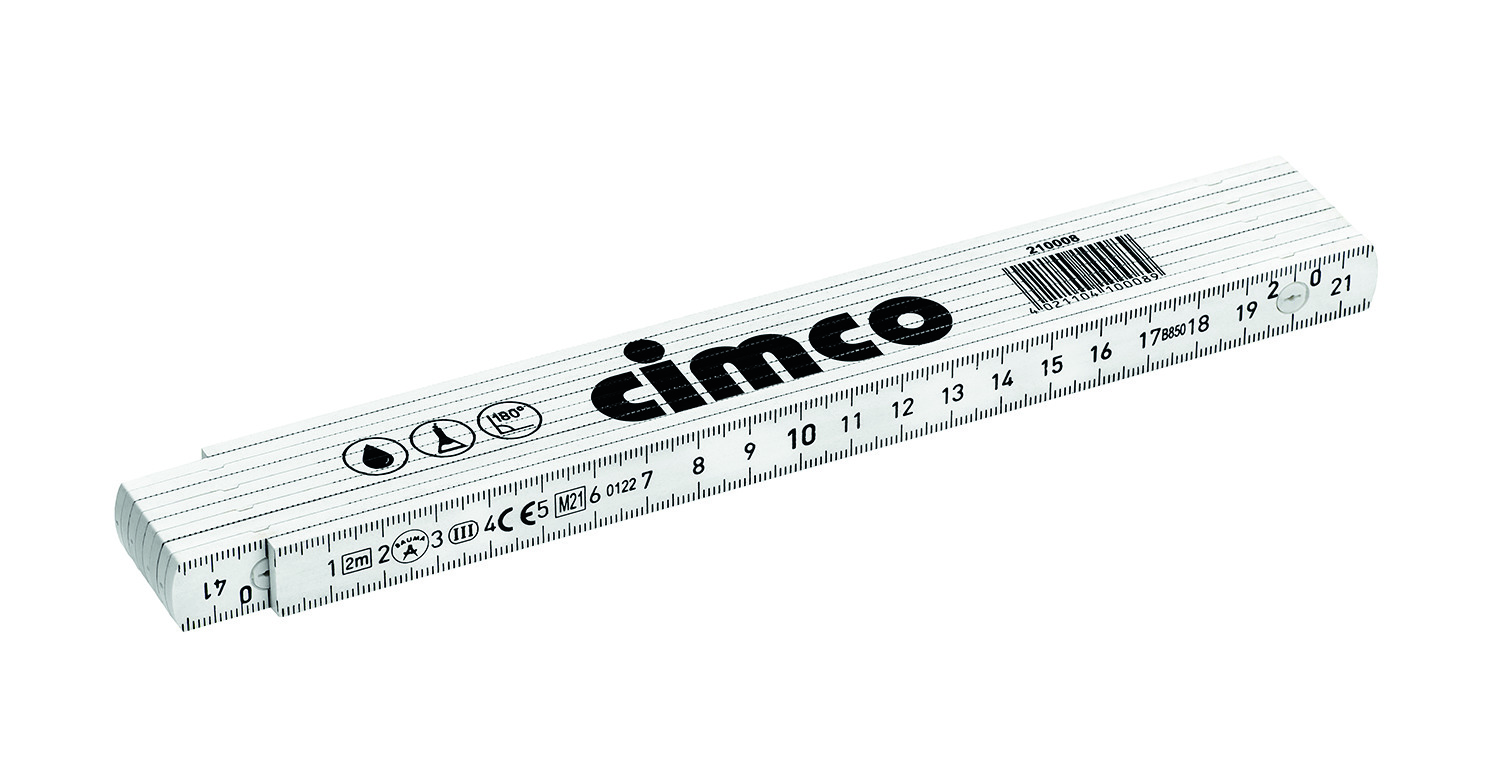 Gliedermaßstab aus Kunststoff und Buchenholz, 2 m Länge. Patentierte 90°-Einrastung und Winkelgradanzeige an jedem zweiten Glied (bis 180°). Ausführung aus Glasfaser, chemikalienfest (weiß)
