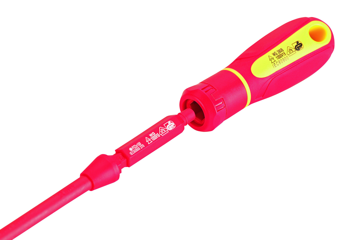 VDE-Schraubendreher-Wechselklingen-Set, 18-teilig, Schraubendreherheft in Zwei-Komponenten-Ausführung, mit Wechselklingenaufnahme, Wechselklingen durchgängig isoliert mit brünierter Klingenspitze, mit aufsteckbarer Drehkappe für Elektronikarbeiten. Phasenprüfer 110-250 V, in praktischer Nylontasche mit Aufhängelasche und Gürtellasche, Schraubendreherheft und Wechselklingen sind nach IEC 60900 bis 1.000 V AC isoliert und GS-geprüft. Lieferumfang je 1x: Wechselklingen für Schlitzschrauben 2,5x 0,4x100 mm, 3,5x 0,6x100 mm, 4,0x0,8x100 mm, 5,5x 1,0x100 mm, Wechselklingen für Kreuzschlitzschrauben PH 1 - PH 2 x100 mm, PZ1 - PZ2x100 mm, Wechselklingen für TX-Schrauben T10 - T15 - T 20x100 mm. Wechselklinge mit Innendreieck 8x100 mm, Wechselklingen mit Innenvierkant 6-8x100 mm, Wechselklingen mit Doppelbart 5x100 m, Drehkappe für Wechselklinge, Phasenprüfer 110-250 V, In praktischer Nylontasche mit Aufhänge- und Gürtellasche