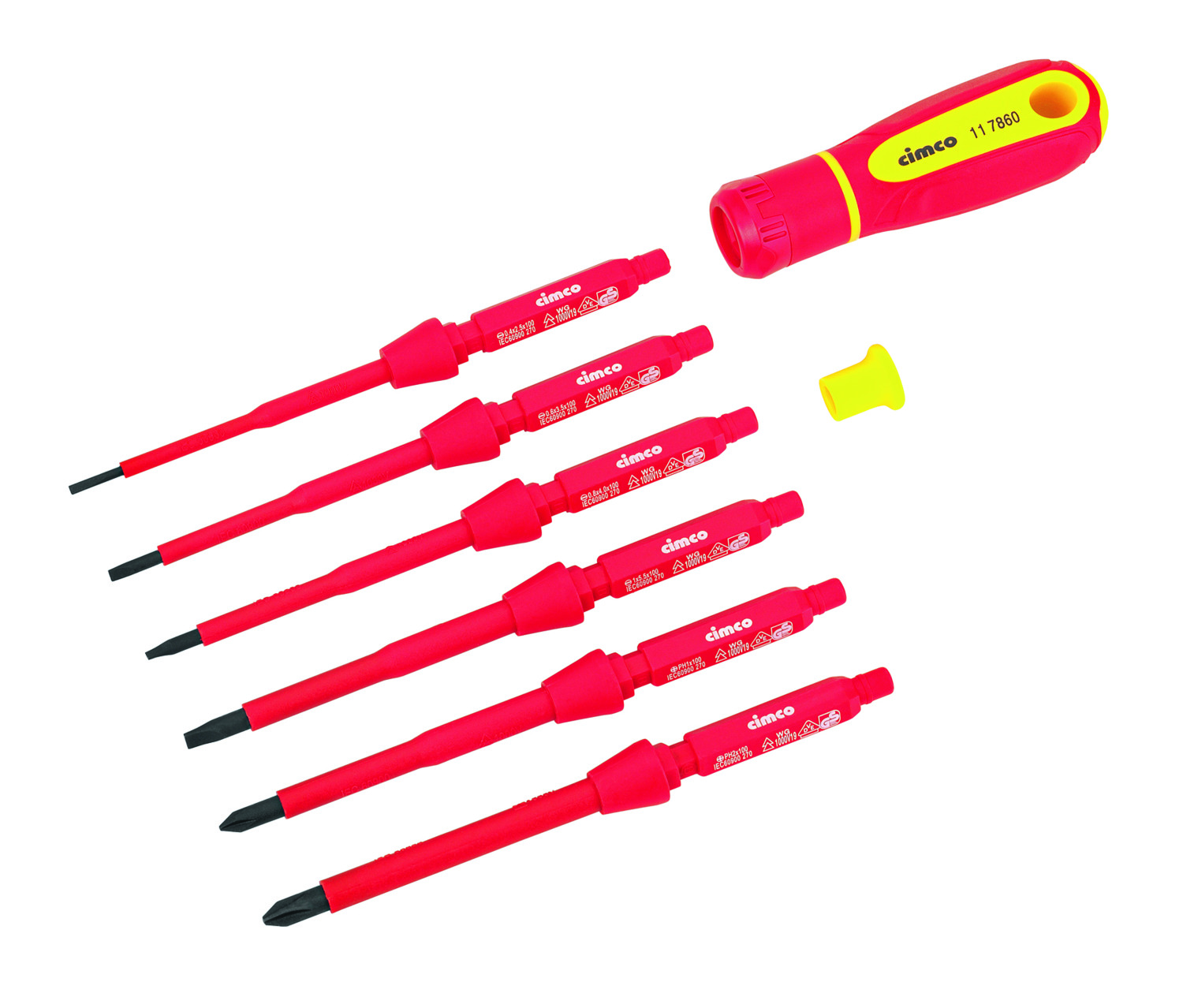 VDE-Schraubendreher-Wechselklingen-Set, 8-teilig, Schraubendreherheft in Zwei-Komponenten-Ausführung, Wechselklingen durchgängig isoliert. Aufsteckbare Drehkappe für Elektronikarbeiten. Nach IEC 60900 bis 1.000 V AC isoliert und GS-geprüft. Lieferumfang je 1x: Wechselklinge für Schlitzschrauben: 2,5x0,4x100 mm, 3,5x0,6x100 mm, 4,0x0,8x100 mm, 5,5x1,0x100 mm, Wechselklingen für Kreuzschlitzschrauben PH 1 - PH 2 x 100 mm, Drehkappe für Wechselklinge, VDE-Schraubendreherheft, Nylon-Tasche