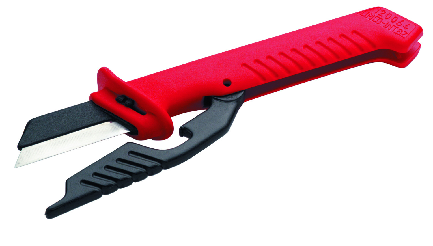1.000 V Sicherheits-Kabelmesser mit isoliertem Klingenrücken und abklappbarem, im Schaft versenkbarem Klingenschutz, mit auswechselbarer Klinge. Einsetzbar für flexible und massive Einzelader. Klingenlänge: 50 mm.