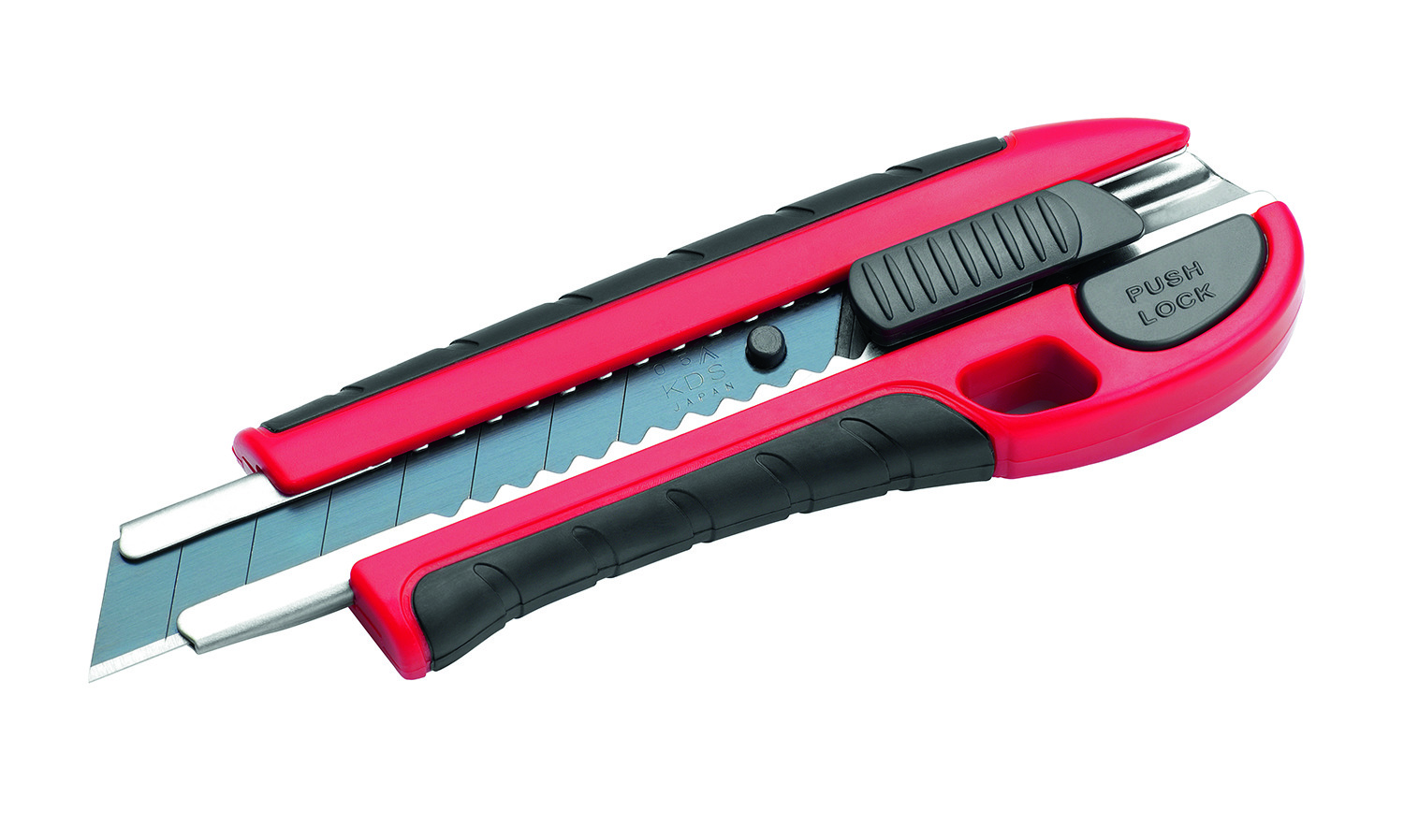 Cutter-Messer besonders scharf und verschleißarm, mit spezial-beschichteten Klingen. Ergonomischer 2-Komponenten-Griff mit weichem Kunststoff, Klingenvorschub mit automatischer Arretierung, 2 weitere Klingenstreifen im Griff