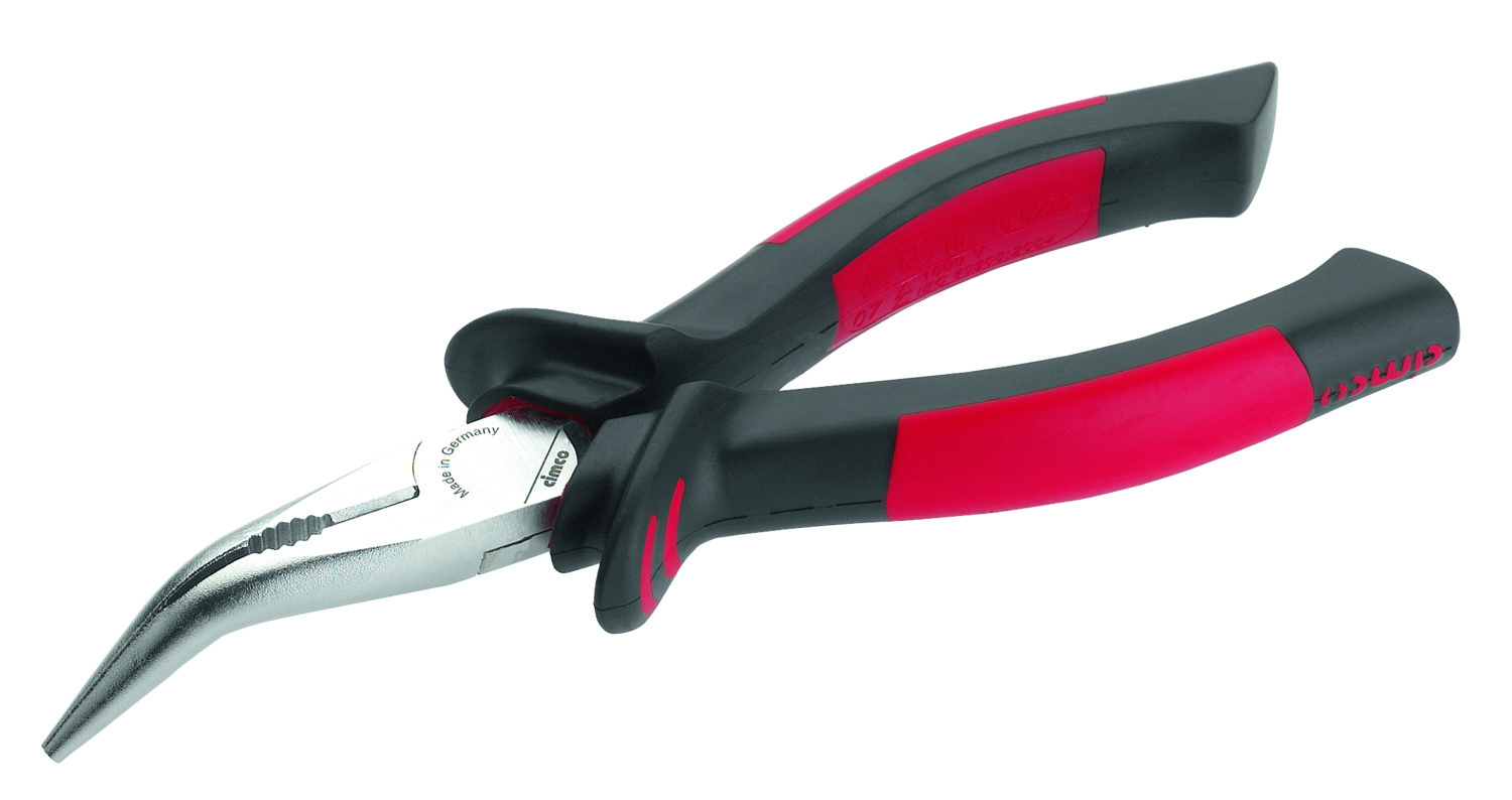1.000 V Telefonzange mit gebogenen Backen nach DIN ISO 5745, eingelegtes Gelenk, Backen 45° gewinkelt, mit induktiv gehärteter Präzisionsschneide (ca. 60 HRC), lange, flach-runde Backen (Flachrundzange), gezahnte Greifflächen und gezahnte Aussparung (Brennerloch), mit Schneiden für harten und weichen Draht, 160 mm