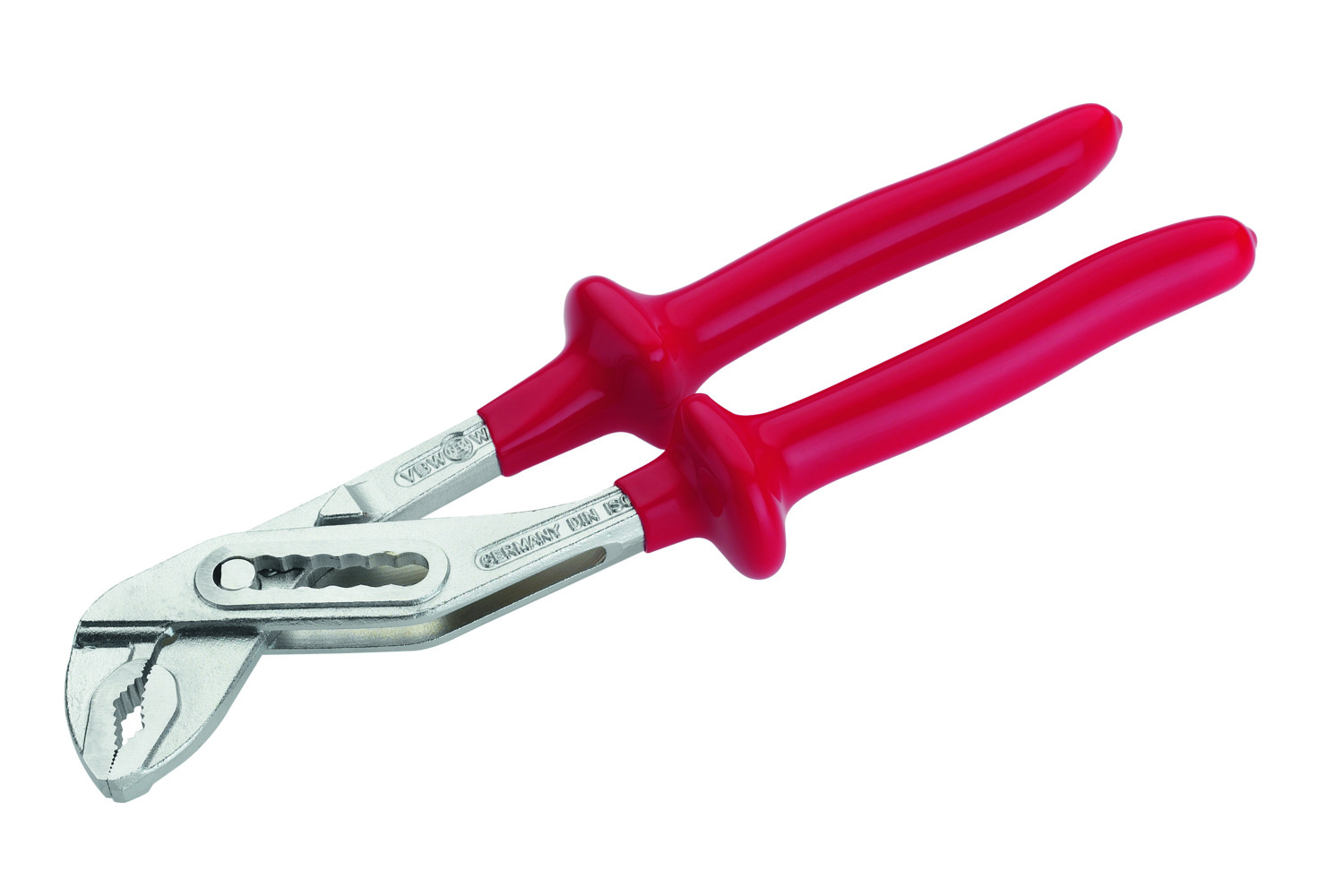 1.000 V Wasserpumpenzange - nach DIN ISO 8976, mit durchgestecktem Gelenk, selbstklemmend am Werkstück, mit gezahnter Aussparung (Brennerloch), aus Chrom-Vanadium-Stahl, 250 mm lang (10") Tauchisolierte Sicherheitszangen, VDE-Geprüft - Griffe mit zweifarbiger Kunststoff-Tauchisolation für optimale Sicherheit. Bei Beschädigungen der äußeren roten Isolationsschicht signalisiert die nun sichtbare untere orangefarbene Kunststoffisolation, dass nun keine 100%ige Sicherheit gemäß den Sicherheitsformen mehr gegeben ist