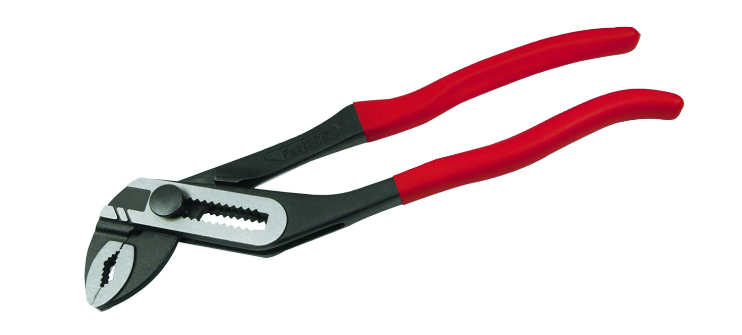 Wasserpumpenzange Fastgrip nach DIN ISO 8976 mit Schnelleinstellung am Werkstück über Druckknopf. Leichtgängige Superfeineinstellung über 12 Rastpunkte. Ergonomisch geformt für höchste Kraftübertragung, selbstklemmend am Werkstück, kraftsparend und abrutschsicher gestaltet. Mit durchgestrecktem Gleitgelenk und doppelter Abstützung. Induktiv gehärtete Maulverzahnung und Sicherheitsklemmschutz. Hochwertig vergütet. Maximale Spannweite 37 mm, Gewicht 392 g, Länge 240 mm